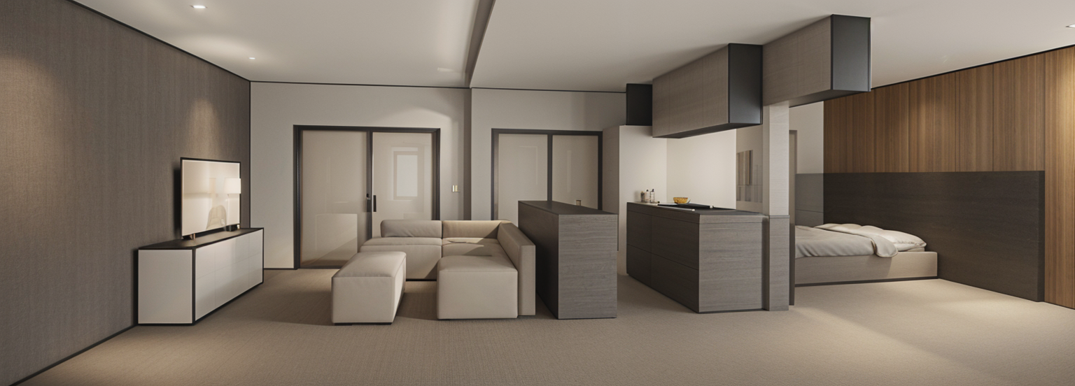 modernist exterior shot a softly styled japanese living space reflecting the gentle routines of daily life inspired by yuriko ishida s home natural materials wood linen ceramic are arranged with understated care the room includes a tidy kitchen shelf with enamelware a calm reading nook with a beige throw and a small stack of books and a table with fresh herbs in a glass jar a small dog or cat can be seen relaxing in the corner the atmosphere is bright with morning light and the view from the window shows the leafy courtyard of a residential danchi expressing quiet contentment and mature femininity architecture
