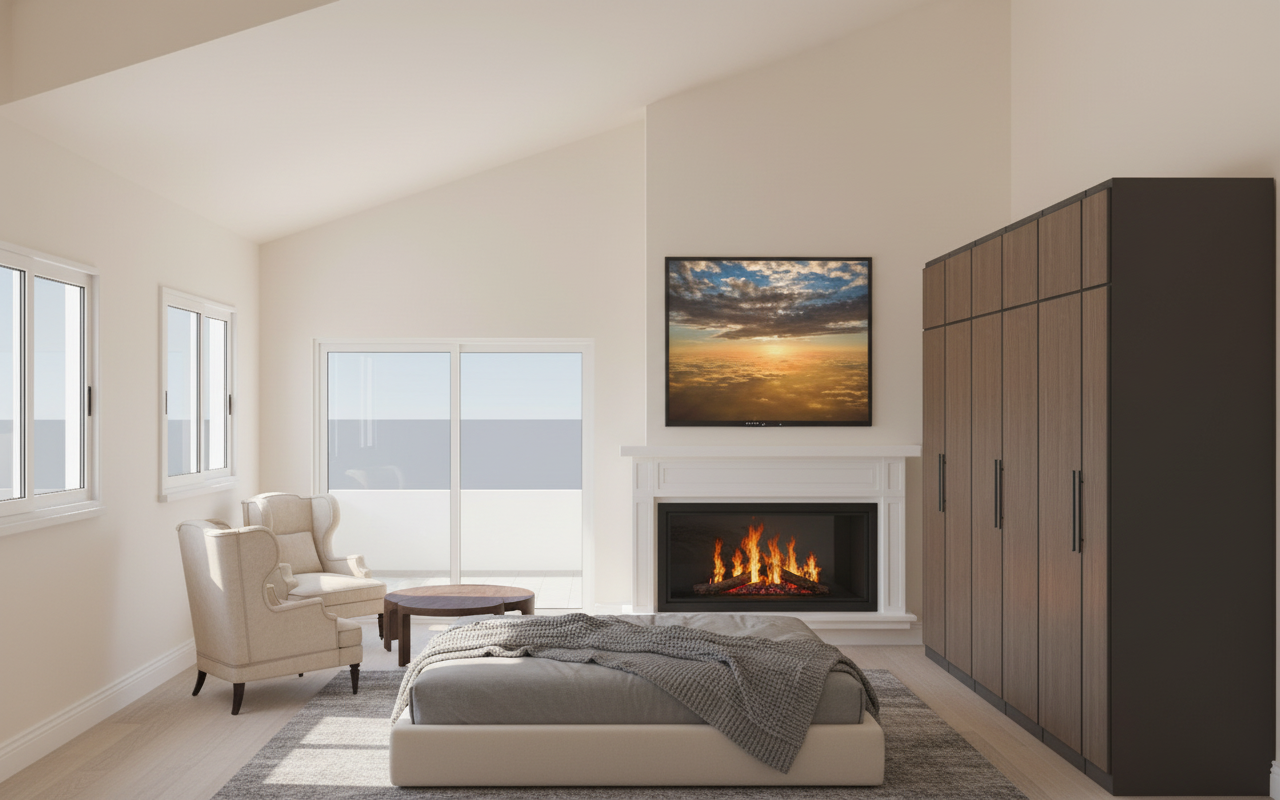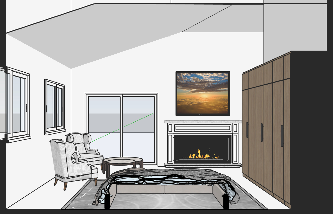 render this interior elevation this is on a second floor and there is a hallway on the right side behind the closets