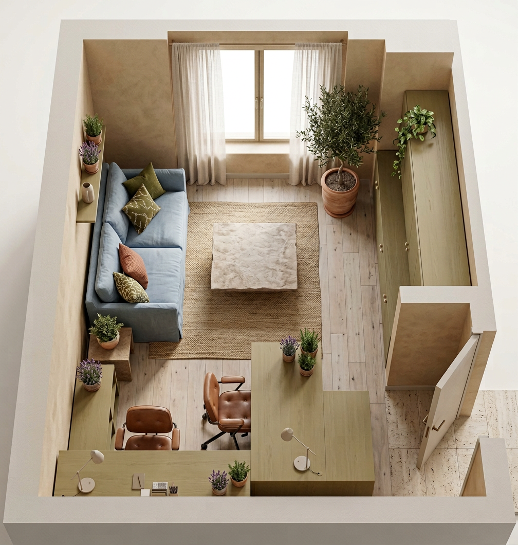 top right closet on blueprint is on the other side of the wall please delete closet there and put just wall change proposal for office desks should be more ergonomic i suggest to put sofa under the window which would give much more space