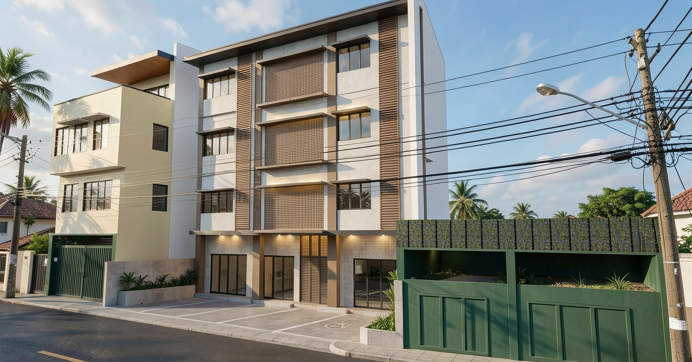 overall mood mid level mixed use philippine building balanced composition slight street life but not crowded realistic daylight shadows natural tropical warmth grounded everyday atmosphere not high end stylized dramatic cinematic over designed upper floors 2nd 4th residential units preserve facade exactly add subtle realism light curtains soft window reflections minor interior shadows slight lived in touches no geometry changes no facade reinterpretation main middle building ground floor commercial units at ground level no signage bands no large storefront signboards no added facade features interior visibility requirement ground floor interiors must appear clearly and warmly lit modest and realistic not high end include visible interiors through glass small local parlor interior only salon chairs mirrors simple wall lighting modest finishes small local caf interior only small tables and chairs simple counter warm lighting casual neighborhood aesthetic exterior signage must be minimal small or implied only no signage bands vehicles park vehicles only within the 5 designated parking slots no side parking no additional street parking vehicle type mid level philippine vehicles common sedans small suvs mpvs no luxury vehicles no high end brands vehicles must feel realistic and appropriate to a modest urban setting