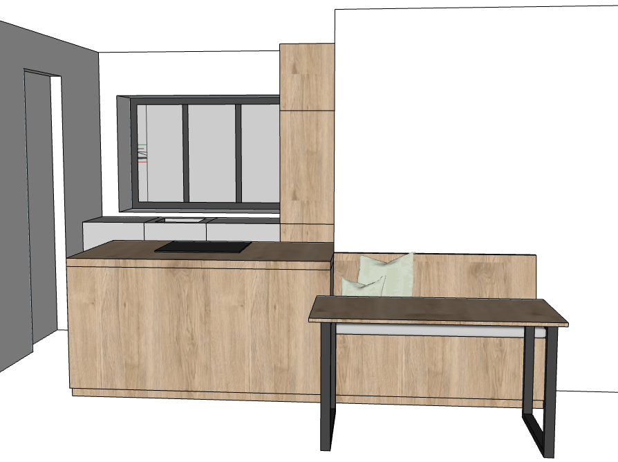 render a modern minimalistic kitchen interior with natural oak wood cabinetry and sleek black countertops the large window is framed with metallic grey casting natural light that highlights the wooden textures the walls are painted in a soft white creating a clean and bright atmosphere the flooring is a light grey stone which complements the dark grey of the supporting structure of the desk add a plush light green cushion on the seating area to add a touch of color the overall atmosphere is warm and inviting blending modern design with natural elements