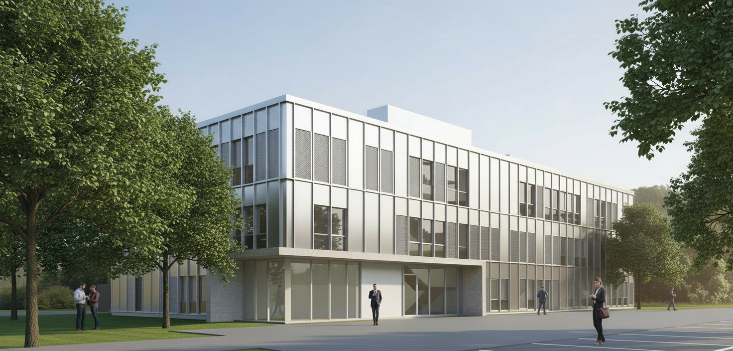 exterior shot create a residential building with brick walls and ceramic rooftiles and solarpanels all standing in a nice and friendly garden with a rural neighbourhood and some trees around the sky should be sunny and friendly with some clouds and birds keep the colors and the shape and the structure of the building make it like an awsome commercial advertisment for a residential building the villa is surrounded by a lot of trees bushes and flowers in the garden