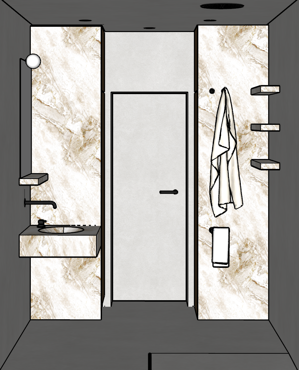 photorealistic image minimalistic bathroom walls door and floor from light white beige microcement washbasin from marble panels left and right from the same marble like the washbasin
