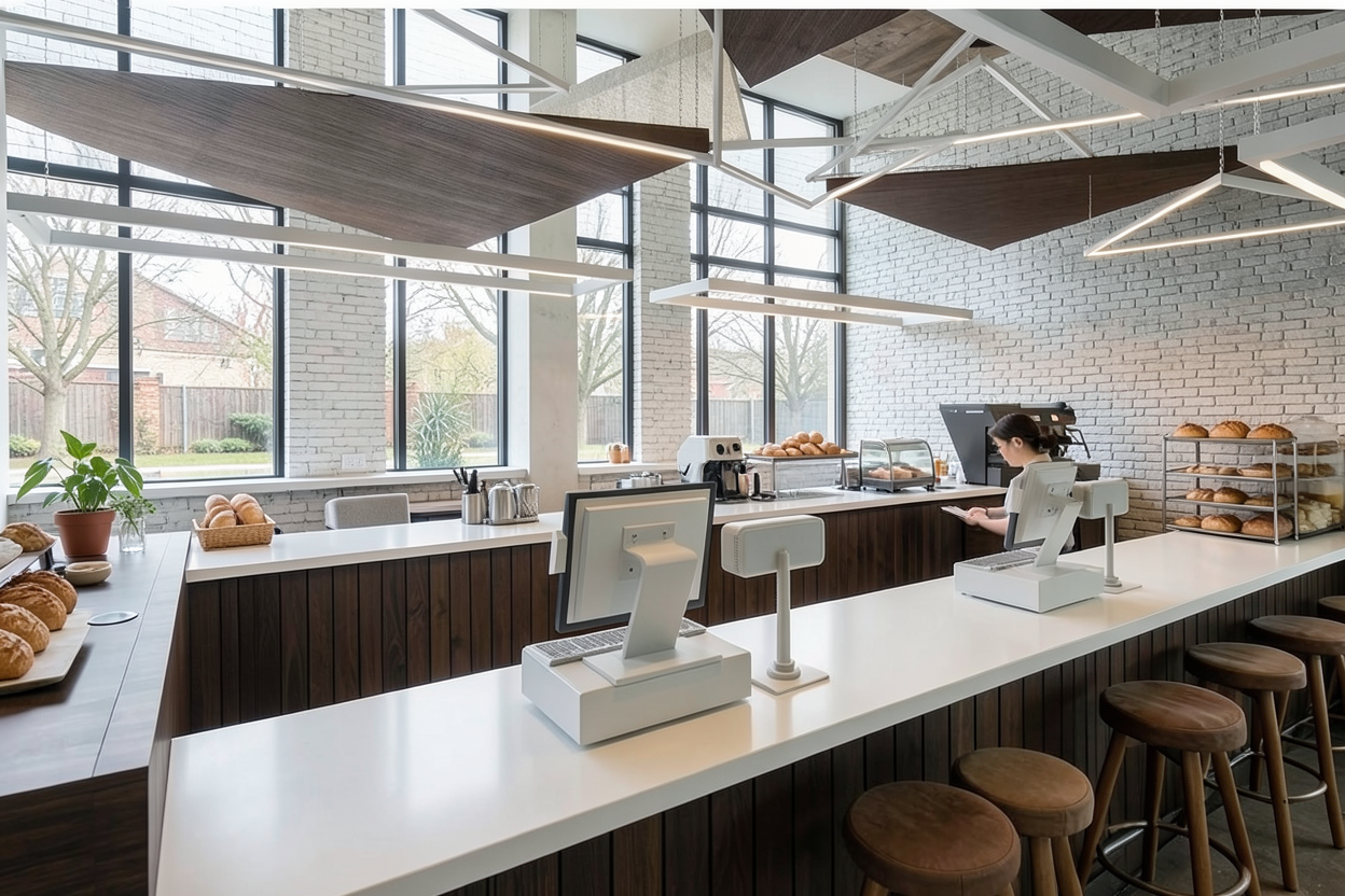 make this a more photo realistic scene maintain the surrounding geometry and fall season trees and soft lighting the building in focus is white and dark precast and white brick