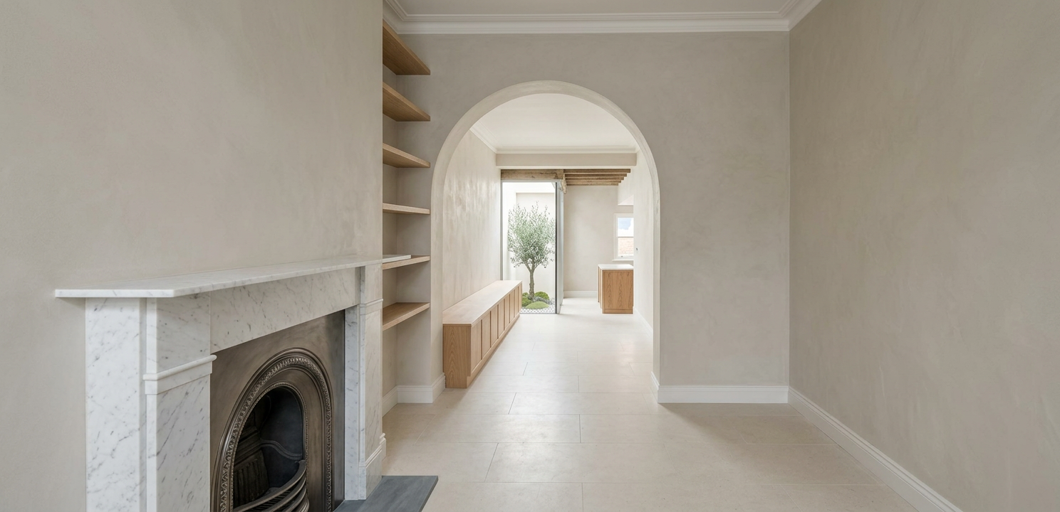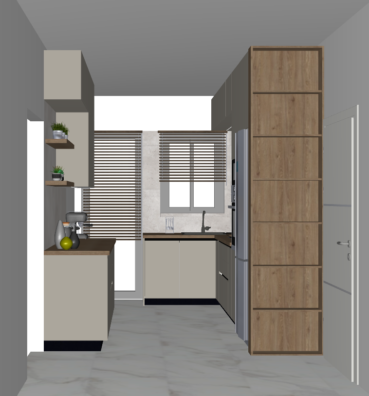 i would like a photorealistic depiction with warm daytime colors showing a beautiful landscape outside the windows and i would like some lights on the ceiling and on the hanging cabinets
