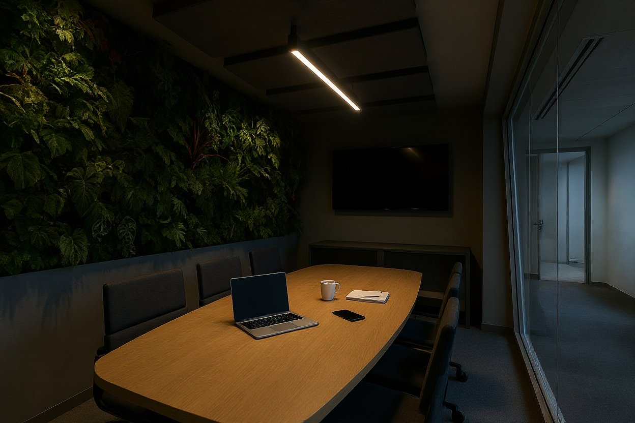 render a serene architectural scene of a small modern wooden house with natural textures and soft lighting the house is made of light oak wood with a smooth finish surrounding structures are a cool slate gray the yard and pathway feature lush vibrant green grass and scattered smooth stones the atmosphere is peaceful and bathed in the warm glow of a late afternoon sun the sky is clear with a subtle gradient from light blue to soft orange near the horizon