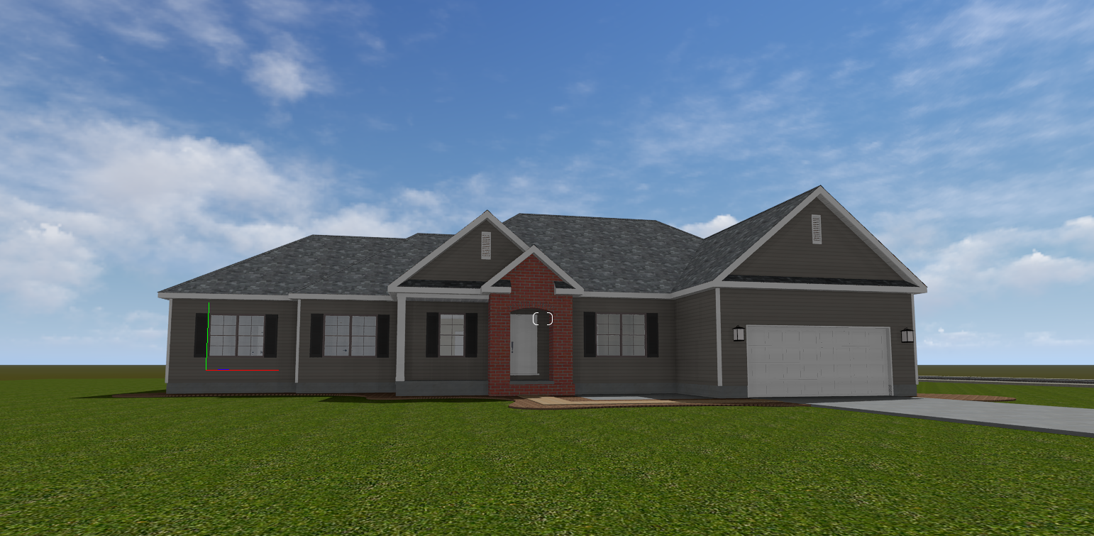 make as photorealistic as possible while keeping textures the same as selection professional landscaping in a lightly wooded scene with good lighting dark grey siding dark roof only show the brick to match the plan