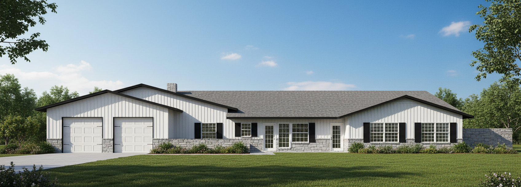 the body of this house will be white board batten style siding installed vertically and from the top of the 40 high kusman stone wainscot around the base of the house the roof shingle will be a medium gray asphalt shingle the chimney adjacent to the garage will also have the existing kusman stone on it the white single hung windows will have black shutters on each side use black for the roof fascia the two openings on the left are section garage doors i need a stone wall to extend from the right side of the garage to the right 16 the glazed opening behind wall will be a pair of white arcadia doors with divided light add the chimney from my image with the kusman stone remove the stone wall extending from the right side of the house remove the stone on the house adjacet to the arcadia patio doors do not vary from the drawing inage i have loaded there is a window were the arcadia doors are shown change the window adjacent to the right side of the garage to a pair of arcadia doors with divided lights add muntins to the bottom sash of the single hung window only use the kusman stone veneer go back to the previous chimney location and remove the stone wall that extends from the right side of the house remove the stone wall in front of the house on the right side change the patio door on the right side of the elevation back to a pair of single hung windows to match the ones on the left side i need a stone wall to extend from the right side of the garage to the right 16 the glazed opening behind wall will be a pair of white arcadia doors with divided light remove the vertical stone columnon the left side of the arcadia doors change the window to the right of the garage back to a pair of arcadia patio doors change the stone veneer to large river rock