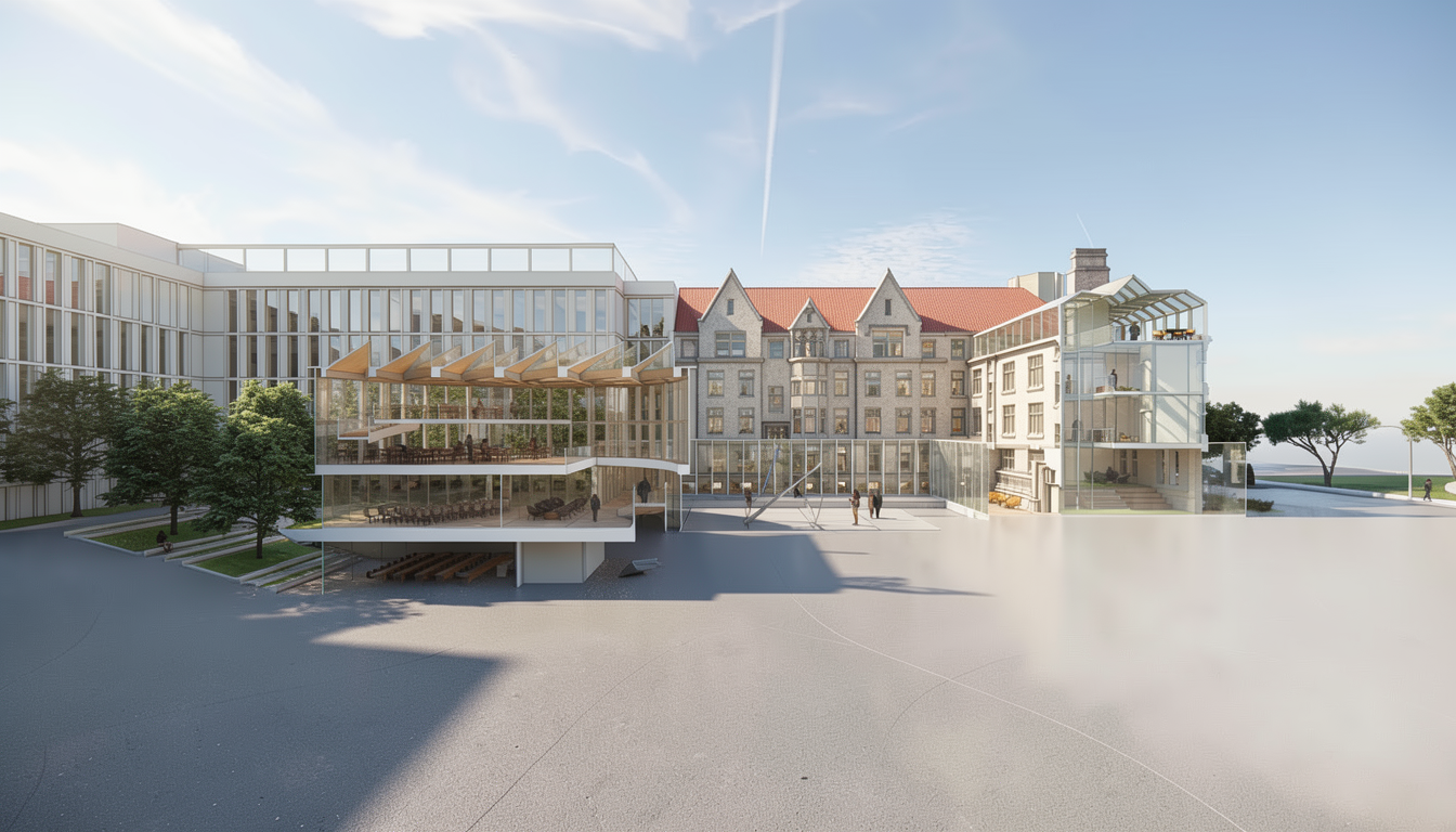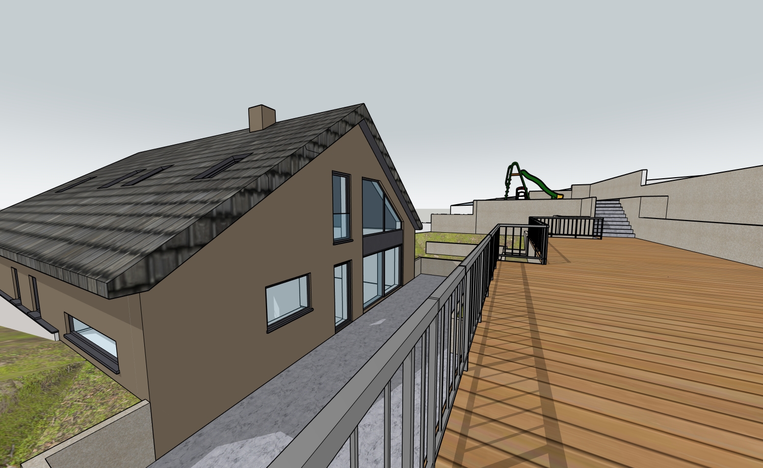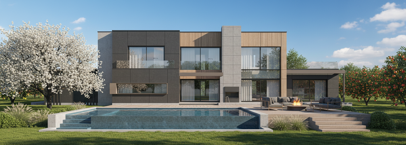 render a photorealistic 3d perspective of this house in luxembourg reference the current material style just enhance them grey brown cappucino keep model geometry the same windows doors roof walls make a lush vegetation that looks like lipperscheid in luxembourg but not in the terrace do not change the view only enhance the current materials and make the landscape nicer vegetation glass reflections and a vibrant clear sky with light atmospheric depth render in hyper realistic architectural visualization quality 8k resolution