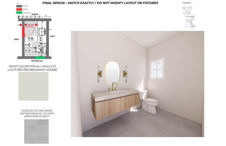 create a photorealistic interior rendering of a small powder room based on the provided reference image use exact furnicher and fixtures match the layout exactly as shown in the image do not move or redesign the placement of the vanity toilet or window style warm organic modern materials floating vanity in light oak with vertical fluted texture marble countertop light with subtle veining brass faucet mirror frame and sconces floor large format gray matte porcelain tile 24 x24 walls warm light beige benjamin moore light pewter tone lighting realistic natural daylight coming from the window soft shadows and ambient interior lighting from sconces warm slightly directional sunlight camera interior perspective from the doorway eye level view slight wide angle lens realistic not distorted rendering style ultra realistic high detail materials soft shadows global illumination realistic reflections and depth do not add extra furniture or decor keep the space minimal and accurate to the reference