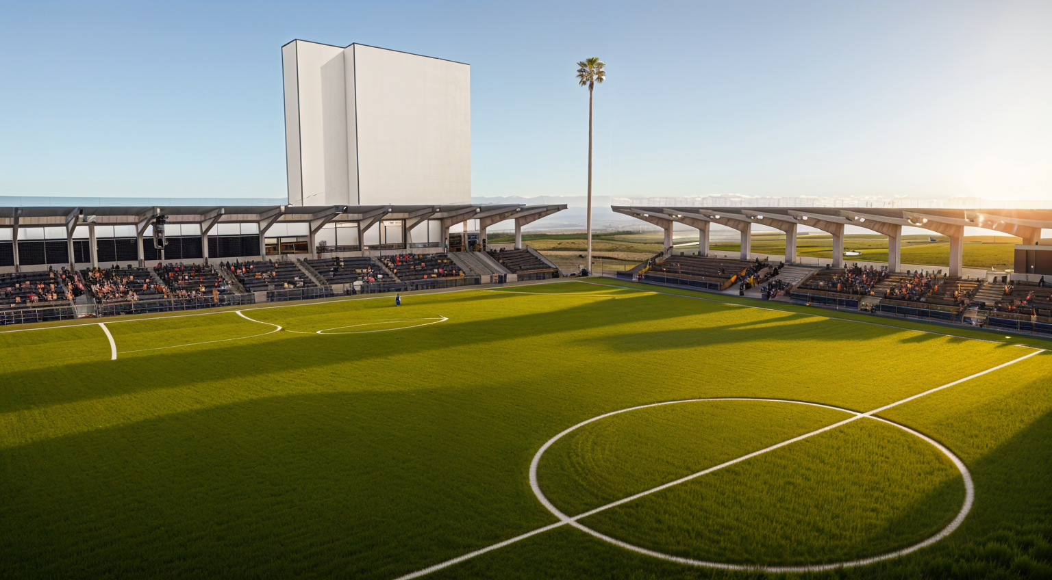 render a modern football stadium with a vivid green field surrounded by sleek dark gray stands the seats are a mix of deep blue and gray capture the bright white lines on the field and ensure the floodlights are a metallic gray standing tall against a clear light blue sky the atmosphere is bright cheerful and inviting suggesting a perfect sunny day for a game