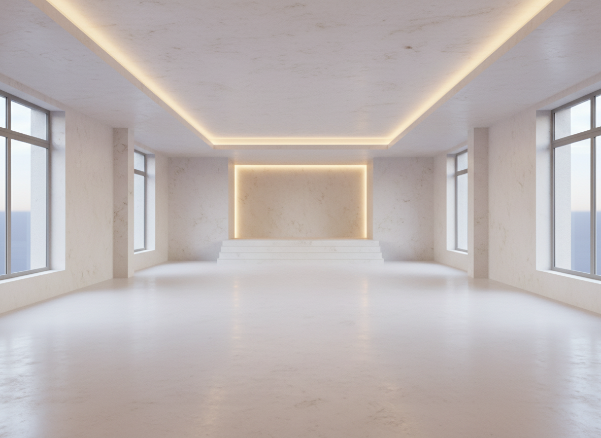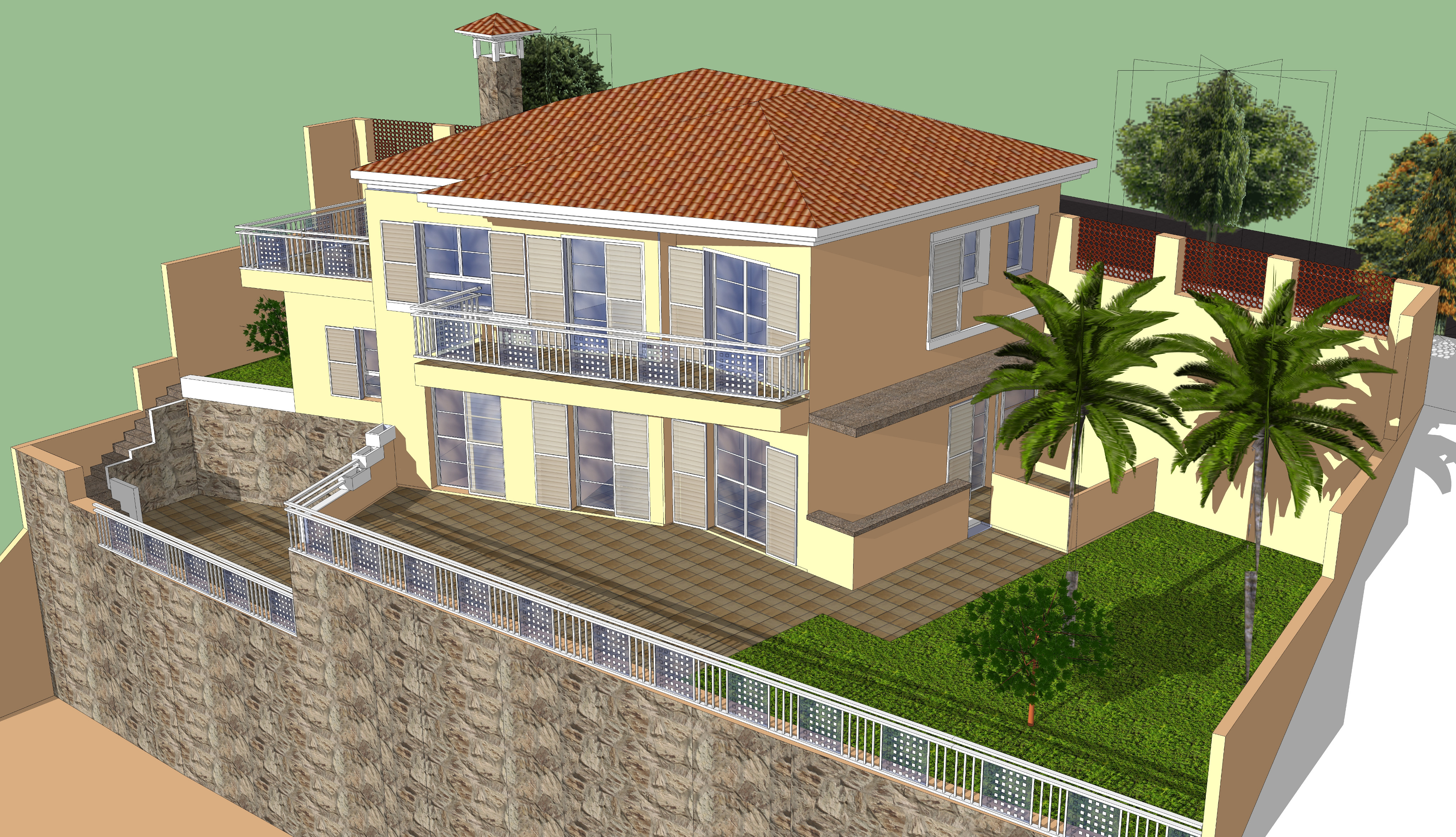 the property has three levels street level the highest garden and open space below the windows and doors will be white lacquered aluminum the colors as shown in the photograph and the roof will be arabic tile the vegetation will consist of subtropical species some palm trees and grass the interior will be visible through open spaces with the living area closest to the garden and the bedrooms above smoke will rise from the chimney it s clear night and there is noon