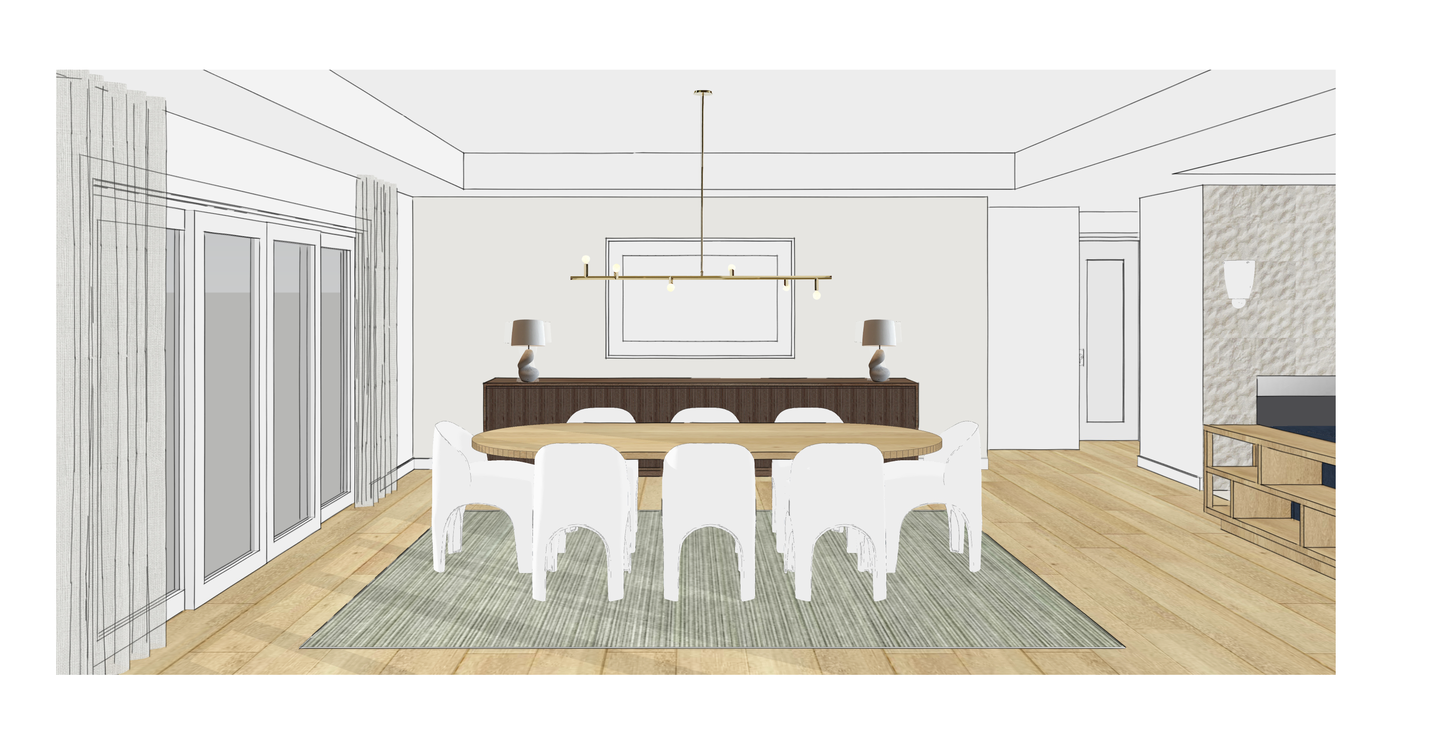 create a beautifully rendered dining room interior a modern minimalist style features textured cream plaster walls providing an elegant backdrop an oval light wood dining table is surrounded by sleek upholstered white chairs set atop a soft muted green rug the floor is warm natural oak wood large airy windows are adorned with sheer white curtains offering a sense of openness views to the outside show tropical greenery a contemporary golden metal linear chandelier hangs above the table emitting a cozy ambient glow the atmosphere is serene and sophisticated with a calming and inviting ambiance