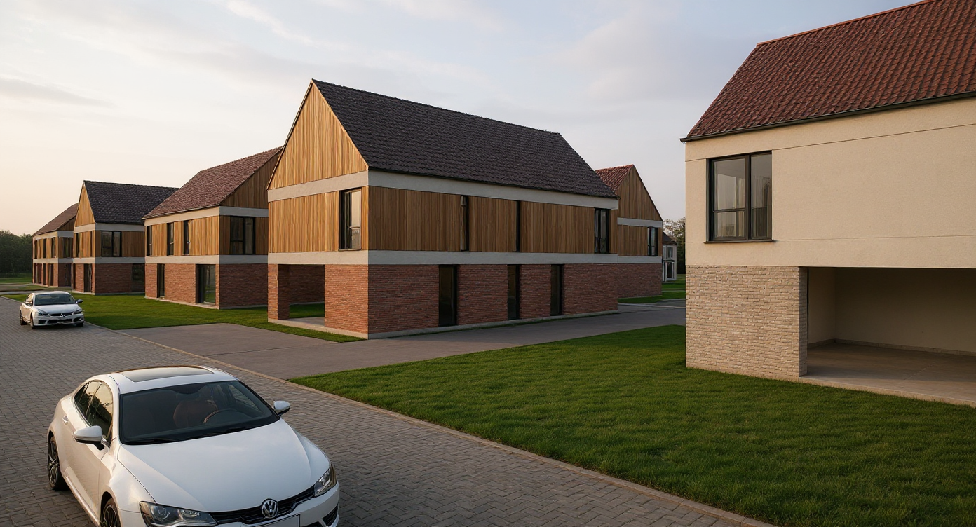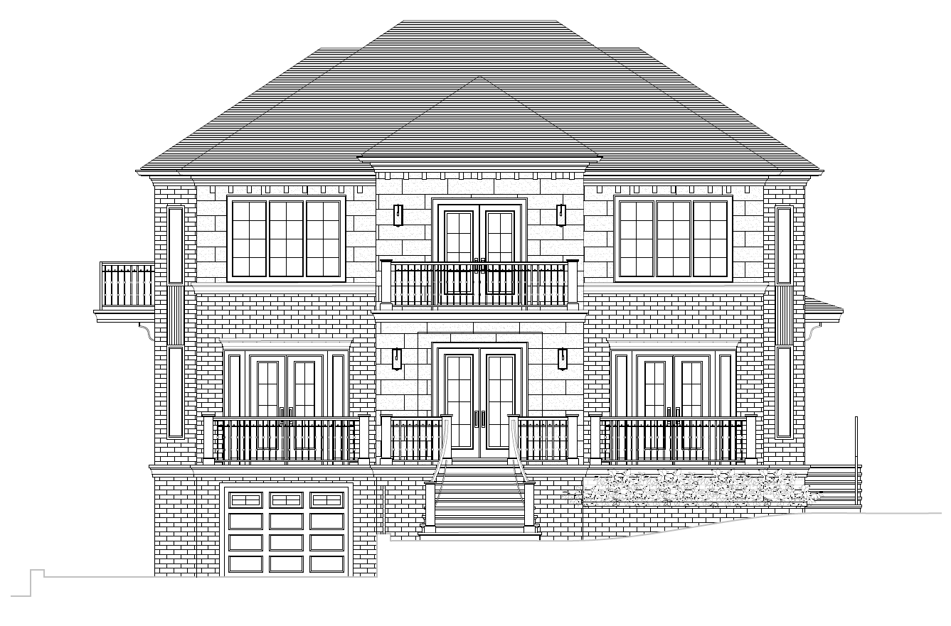 please make a realistic render with warm modern tones and black window frames set in a residential neighborhood with some large mature trees in the background keep existing material showing natural brick natural limestone dark slate roof and contemporary accents
