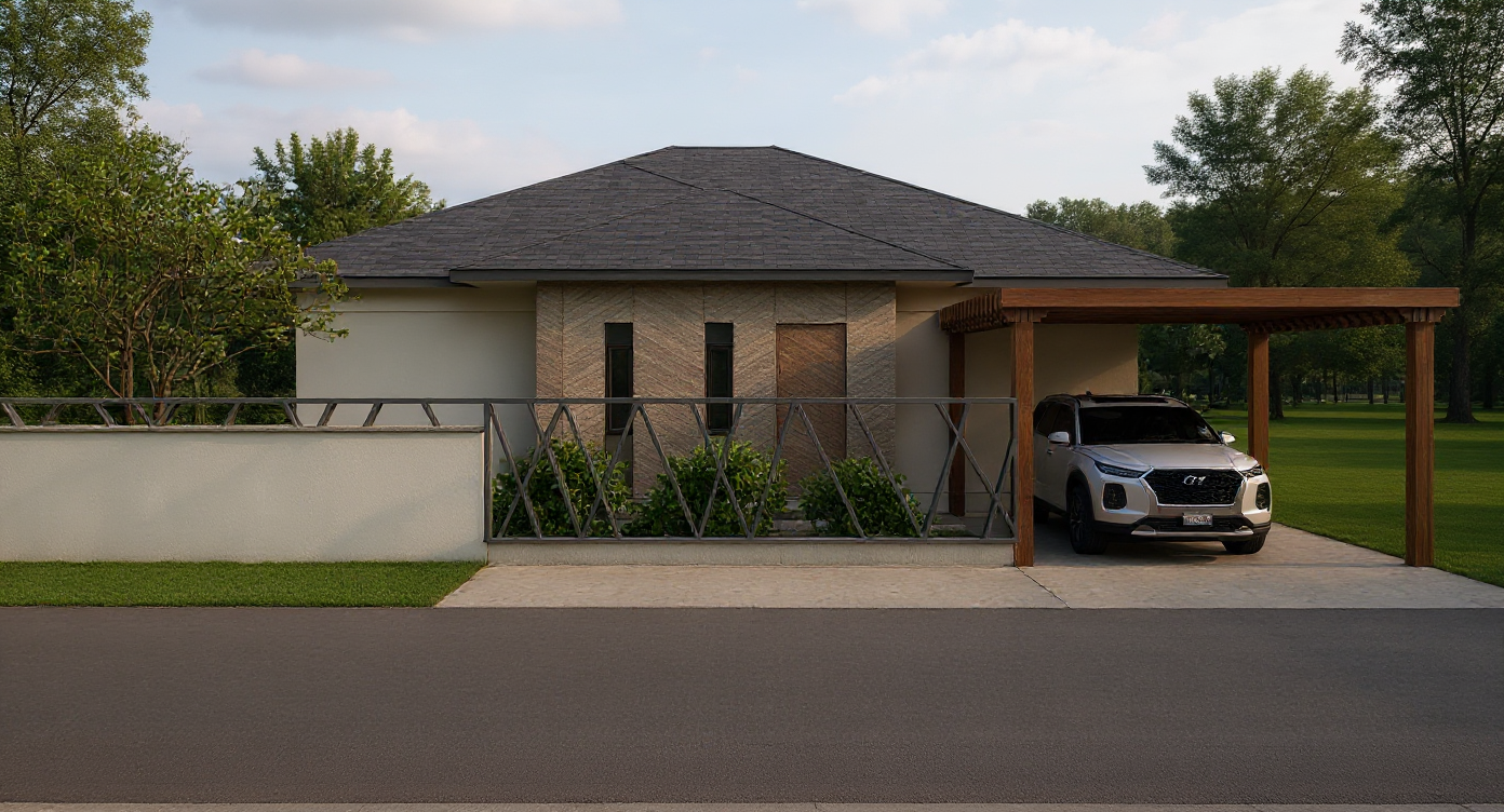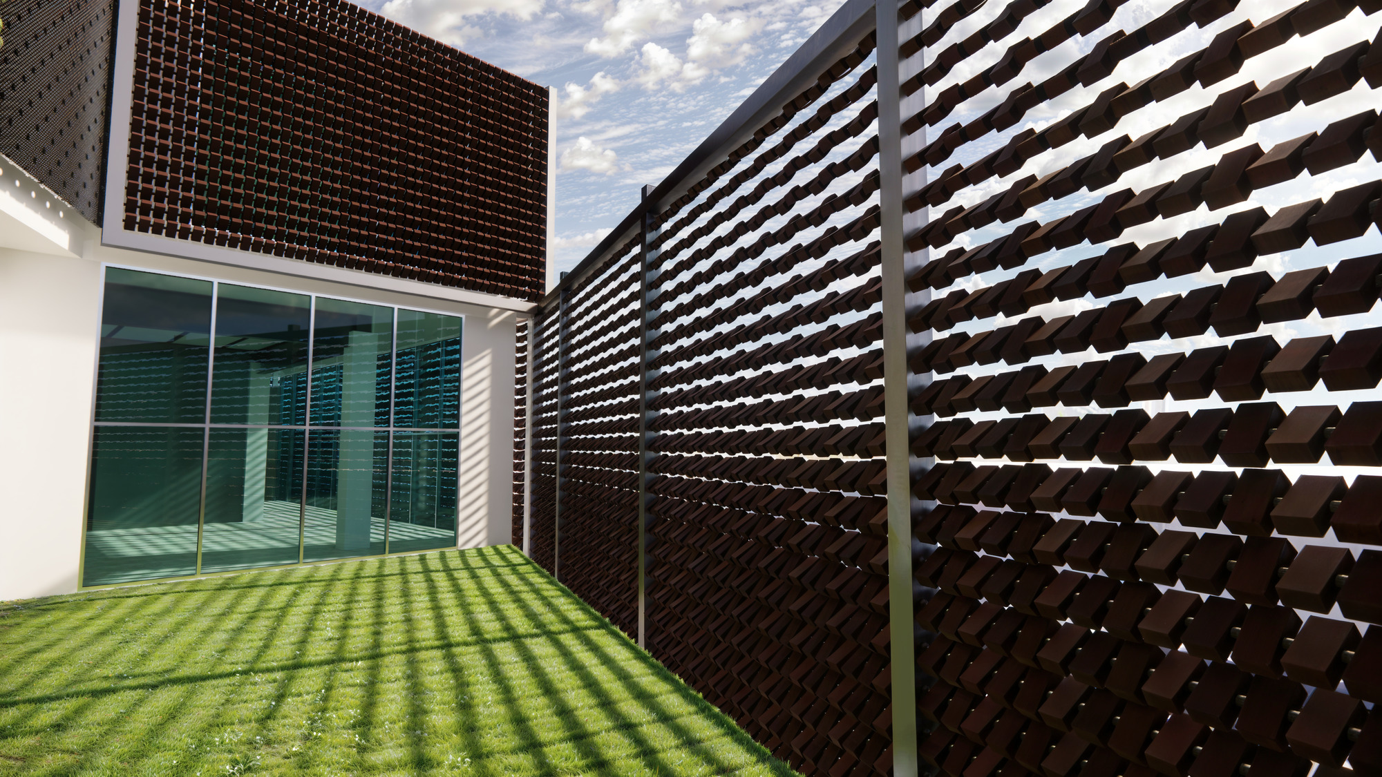 make the image look like the style of the reference make the bricks a more brick color and make the glass a bit more look less green