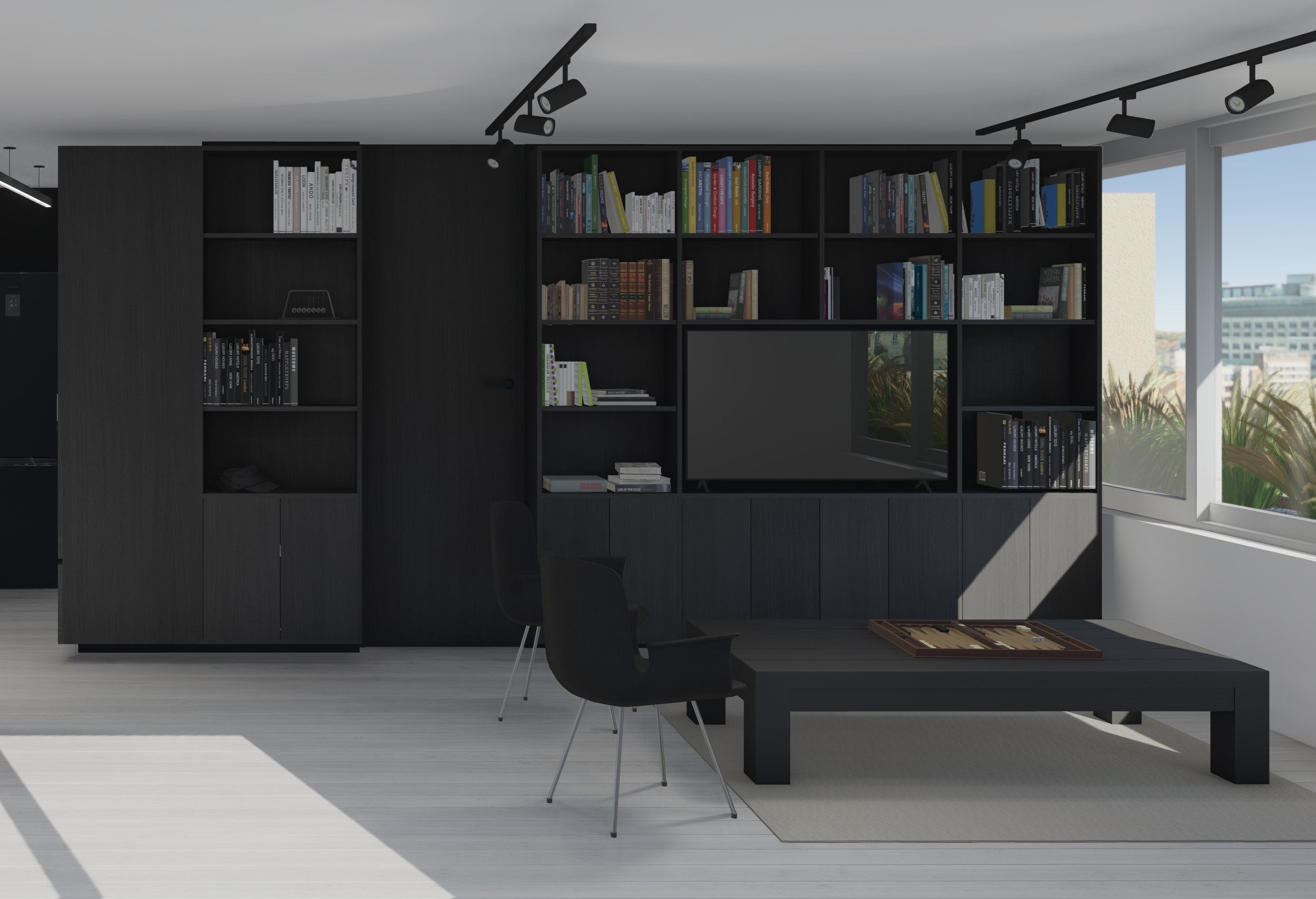 render objective maintain existing geometry and materials improve lighting quality and create a refined scandinavian atmosphere architectural photography style strict constraints do not modify geometry do not change materials except where explicitly requested do not alter layout proportions or dimensions apply only the listed changes right side foreground replace elements remove the black chairs remove the existing coffee table remove the existing rug add one coffee table with light wood legs and a glass top place a cowhide rug underneath the new coffee table maintain realistic scale and natural placement right side windows change window frames to black keep window size position and proportions unchanged lighting and color control improve natural daylight soft diffused scandinavian light neutral white balance remove any yellow color cast bright clean balanced exposure camera and perspective correct vertical lines ensure perfectly straight verticals apply architectural photography lens correction