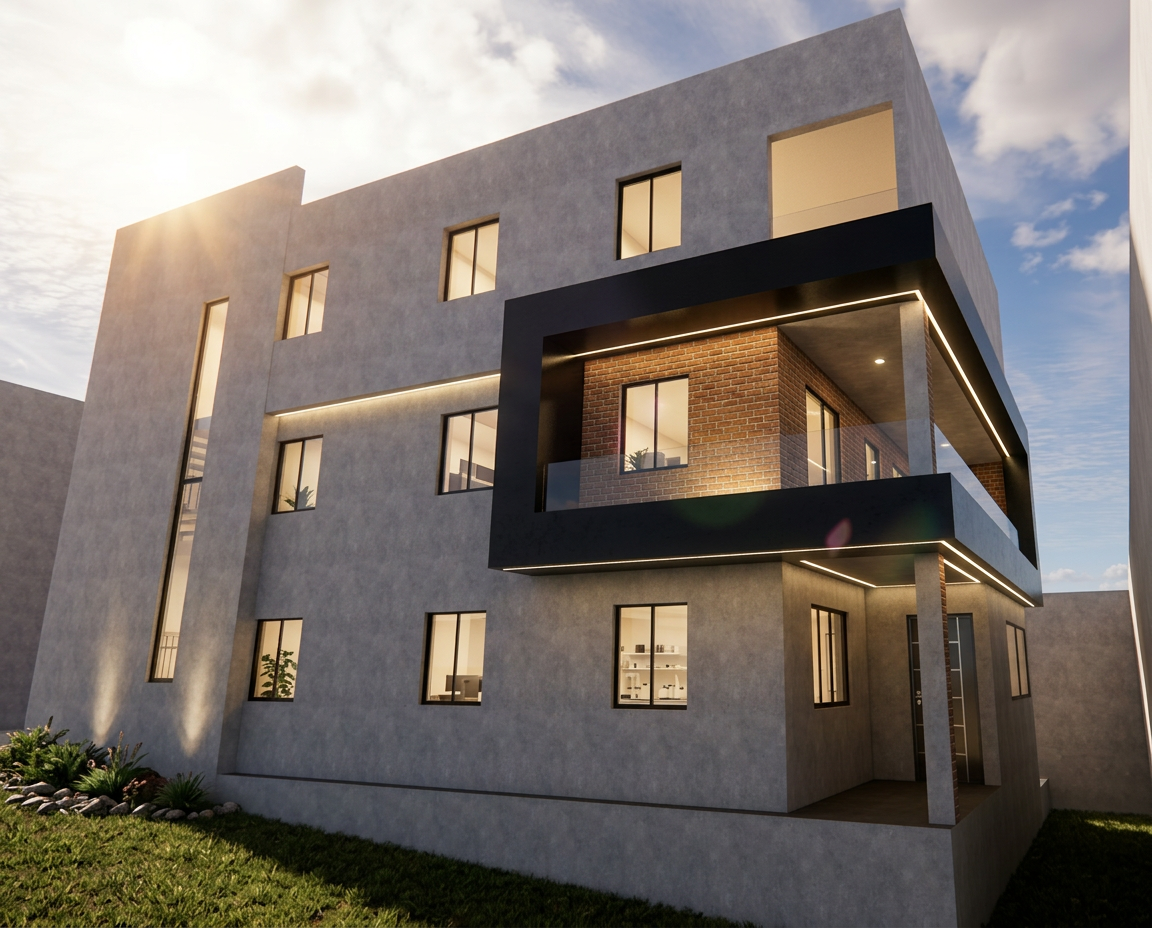 recompose the existing fa ade windows by combining vertical accent windows with wider horizontal openings maintain general window locations but adjust proportions for a more intentional architectural rhythm introduce one double height window as focal elements while enlarging select horizontal windows for contrast preserve concrete texture brick volume and black framing element achieve a balanced modern industrial fa ade with refined proportions improved natural light and cohesive composition high quality architectural visualization