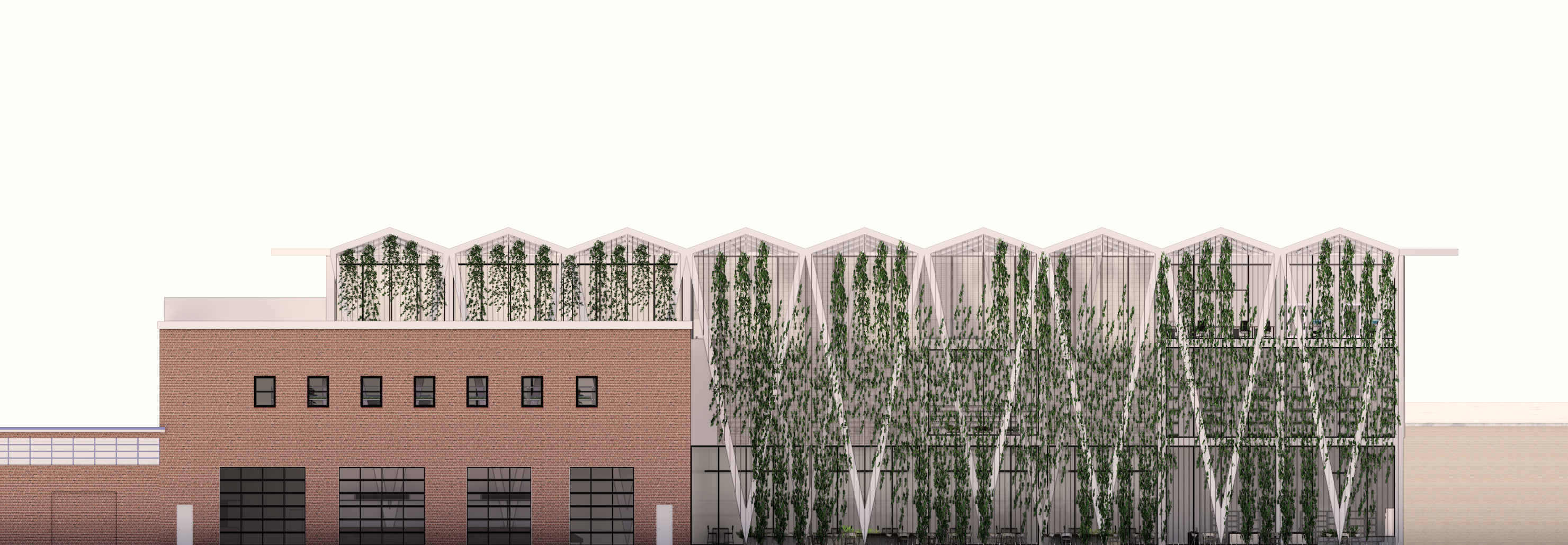 re render this image exactly as modeled and framed same full elevation proportion same camera distance same materials same lighting same brick building and greenhouse structure do not crop or tighten the composition the full horizontal elevation must remain visible at original scale only modification required improve the vegetation realism the climbing vines on the greenhouse fa ade should appear more natural varied and believable with irregular clustering varied density gaps where structure shows through subtle layering depth thinner tendrils at edges slightly uneven vertical reach think less repeating pattern and more ecological growth behavior everything else stays identical no changes to structure glazing mullions diagrid geometry no edits to brick texture door composition or tone no lighting shift keep warm interior glow as is no atmosphere change no new context no camera repositioning