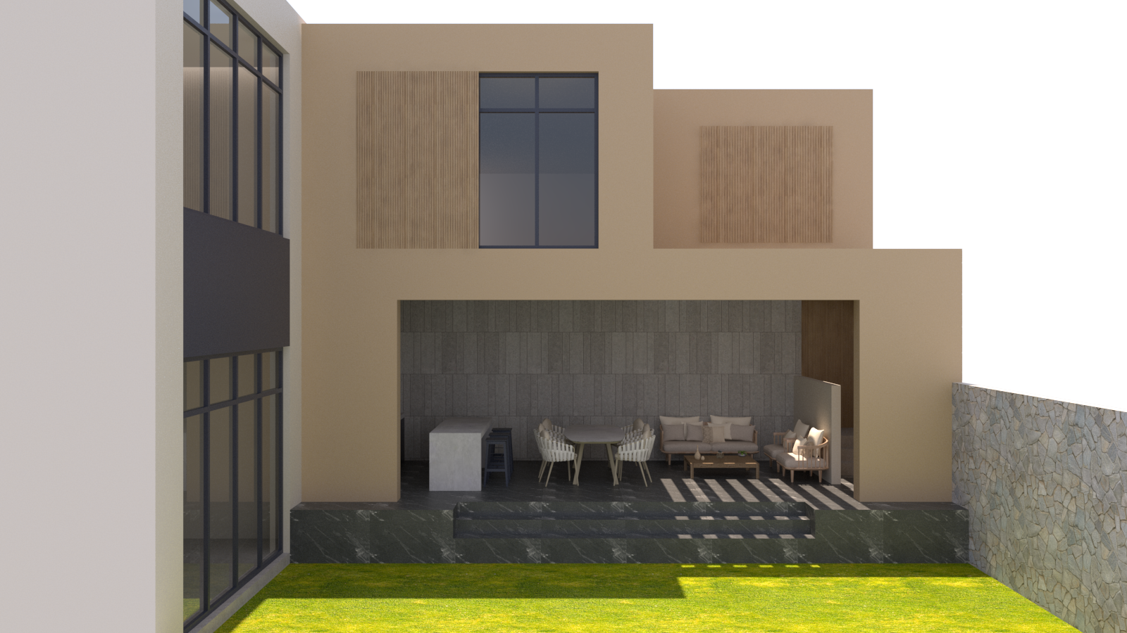 a modern minimalist two story house with a beige facade and large dark gray windows the exterior is accented with warm wooden panels adding an elegant touch the outdoor patio features a sleek stone floor in dark gray complemented by light gray walls a cozy seating area includes a light gray sofa and round dining table with white chairs the stone wall to the right has a natural texture in varying shades of gray the surrounding lawn is vibrant green contrasting beautifully with the architecture the atmosphere is serene with soft natural daylight illuminating the scene