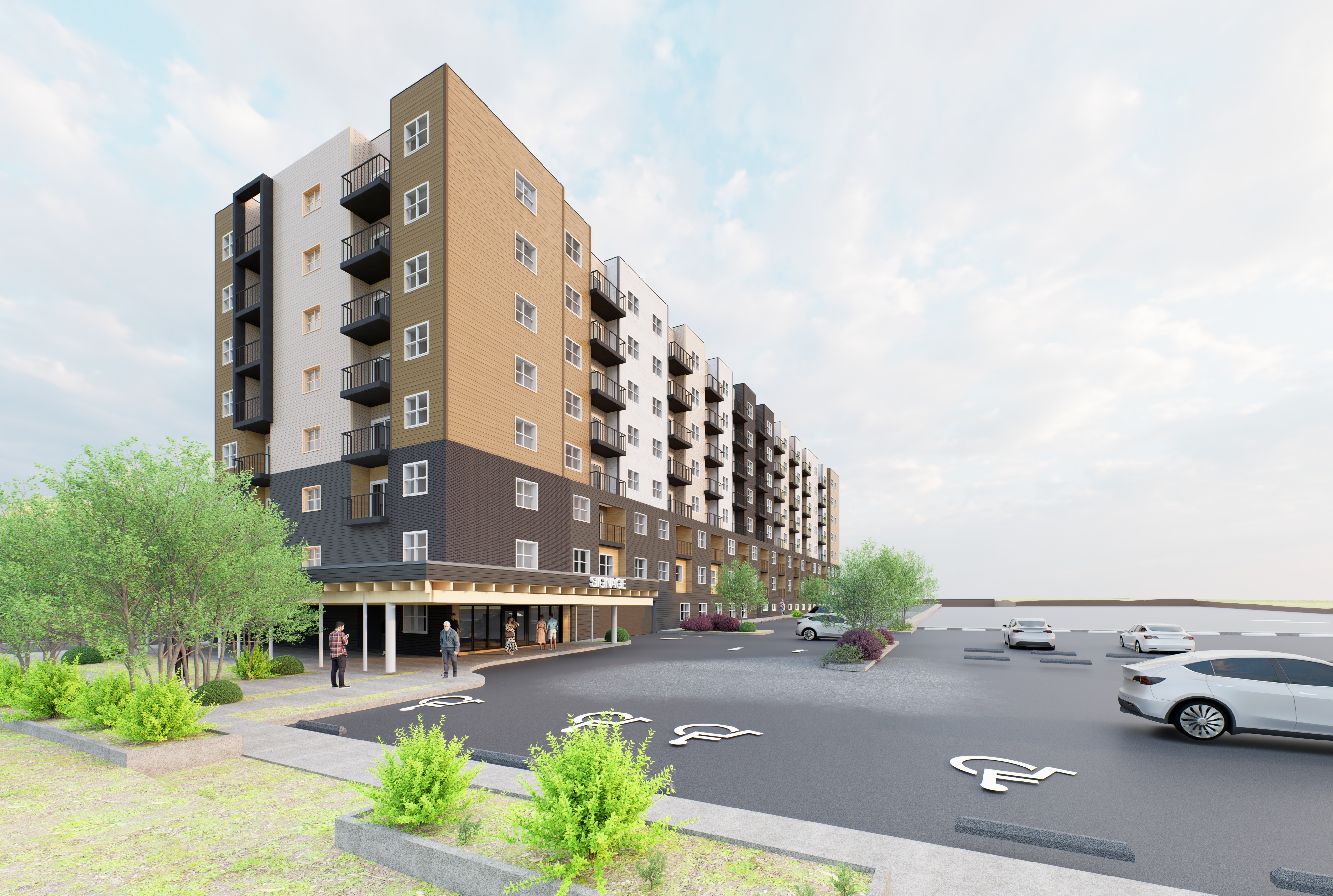 photorealistic architectural visualization based strictly on the provided image preserve exactly the original building geometry massing proportions floor count fa ade layout openings edges and overall structure do not modify the building shape dimensions roof volumes or alignment in any way preserve these materials exactly as indicated in the original image do not change material types colors finishes patterns panel sizes or material placement only enhance the existing brick and hardie siding to appear more realistic by improving texture resolution surface detail joints roughness subtle color variation weathering and physically based light response material intent palette and architectural design must remain unchanged the building is located in vernon british columbia canada context elements must accurately reflect this location vegetation typical of the okanagan region coniferous and deciduous trees shrubs dry climate landscaping vehicles typical of a canadian mid size city people dressed appropriately for a mild canadian climate introduce realistic context elements add people at correct human scale interacting naturally with the building add realistic vehicles properly scaled and placed add vegetation logically integrated with sidewalks and streets use realistic daylight conditions appropriate for british columbia with soft natural shadows and balanced exposure camera perspective framing and composition must remain consistent with the original image maintain realistic colors neutral tones and professional architectural visualization quality high realism clean render natural atmosphere contemporary urban architectural style any structural geometric or material change is strictly forbidden this is a visualization enhancement only not a redesign