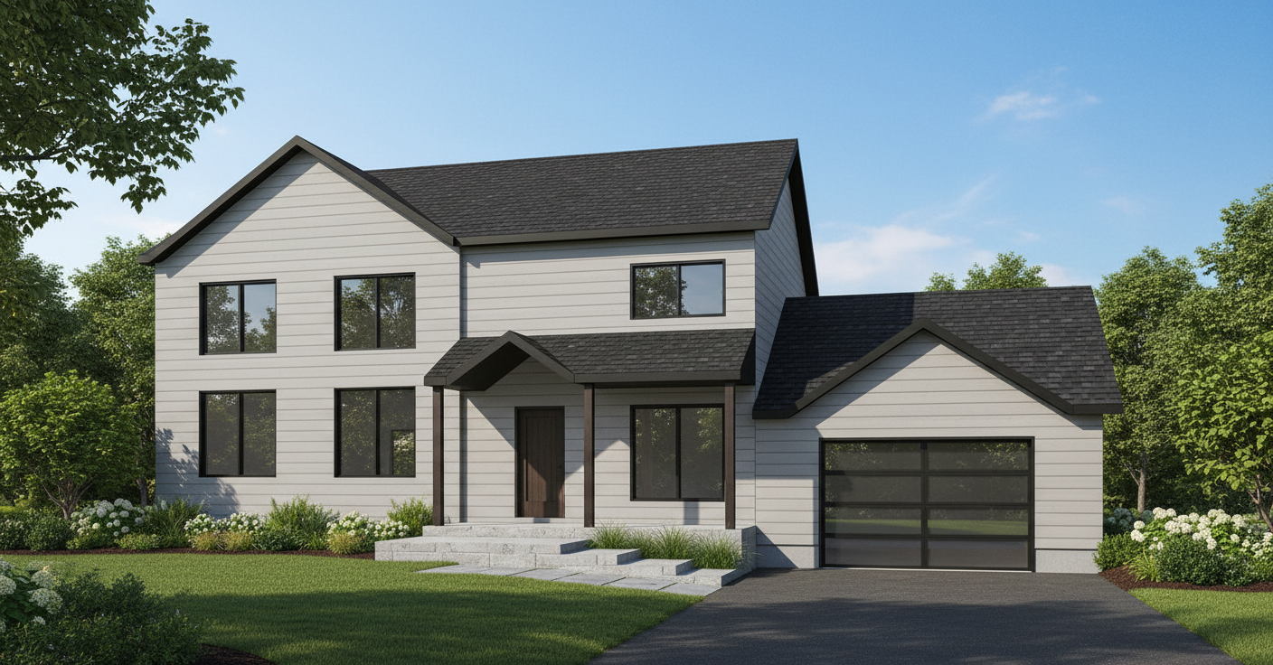 suggest a transitional style with trees black roof tone on tone siding no wood no brick simple garage door