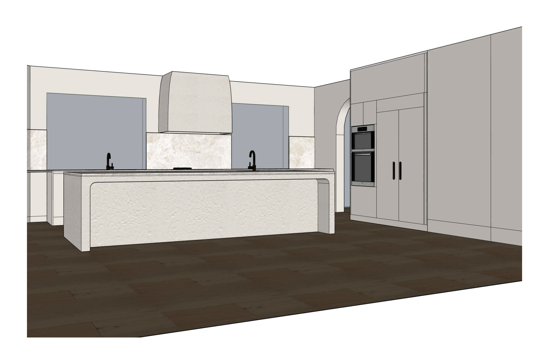 kitchen island front is microcement along with the range hood the countertops are vanilla marble the cabinets are a slim shaker the walls are plasterboard