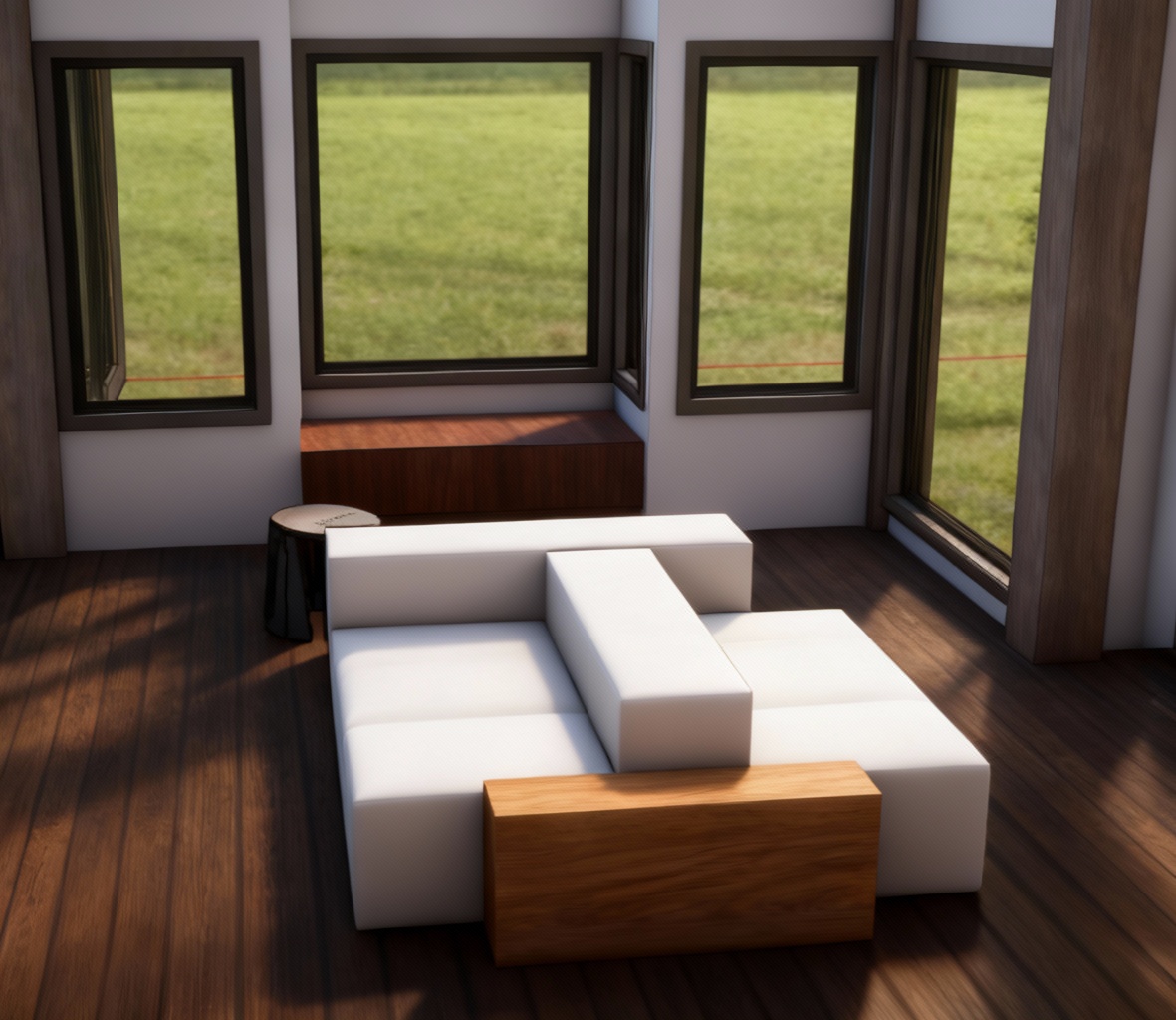 exterior shot change the white brick of the piece of facade on the right side to a dark gray brick concrete color and change the left side of the facade dark to white do not touch the wood or anything else architecture