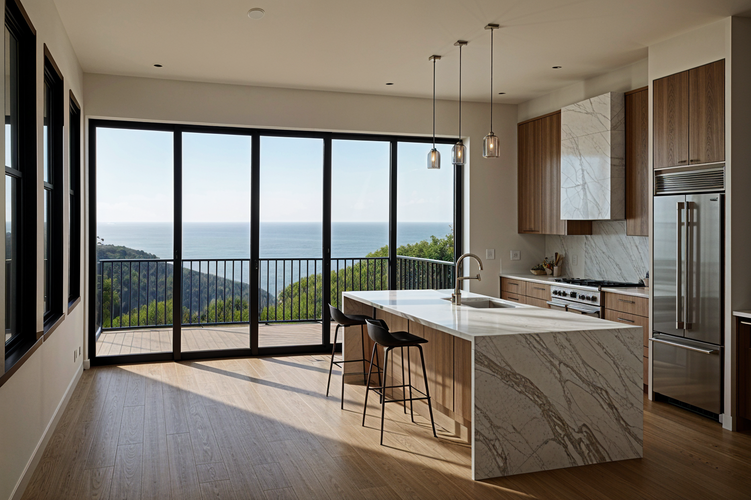 view outside window is a deck with rear yard on lower level just show trees in the back flat ground no mountains show some neighboring houses across