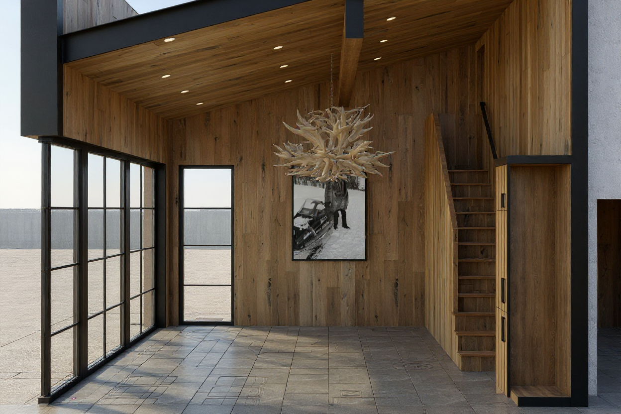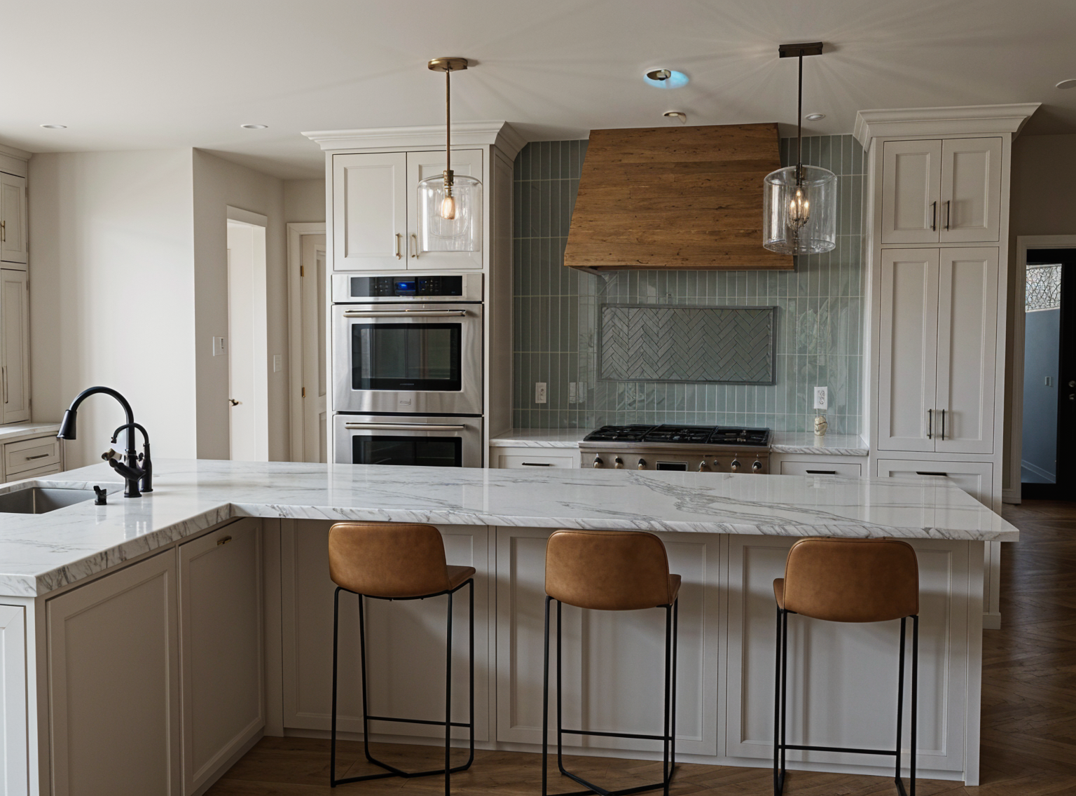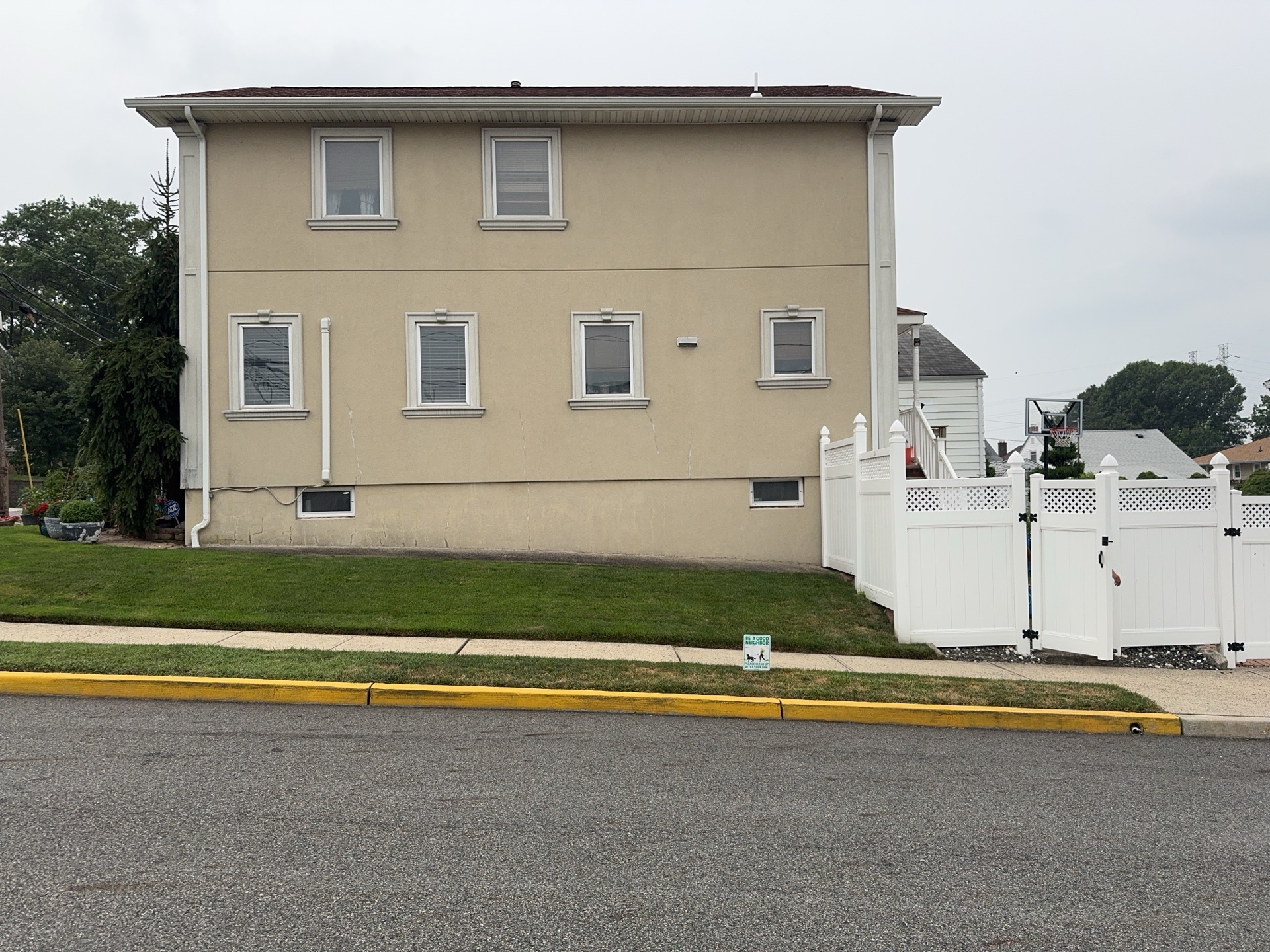 blue vinyl siding with white trim and stone veneer below