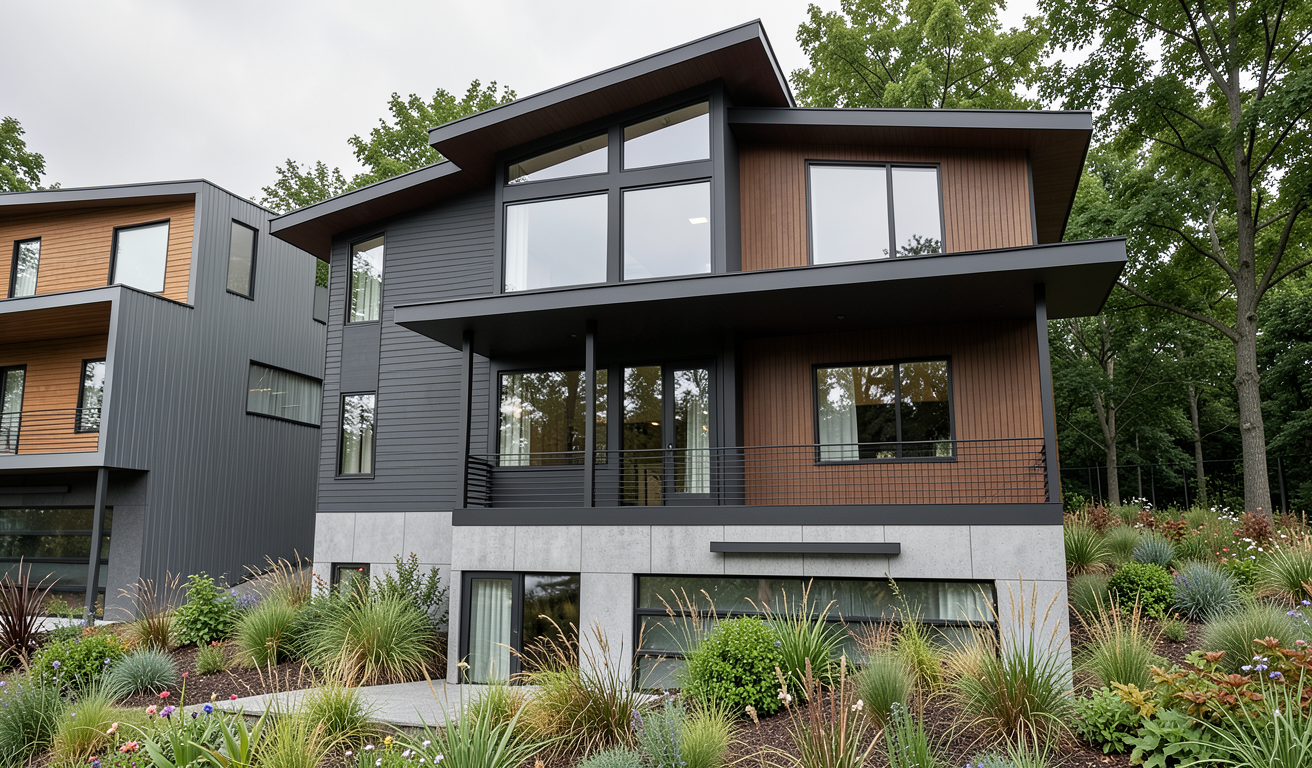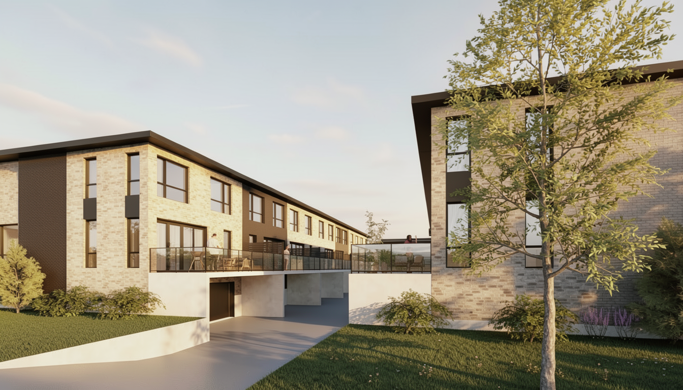 generate beautiful elevations renders with light inside with white stucco on front walls and black tile roof top down from above with sunlight at dusk