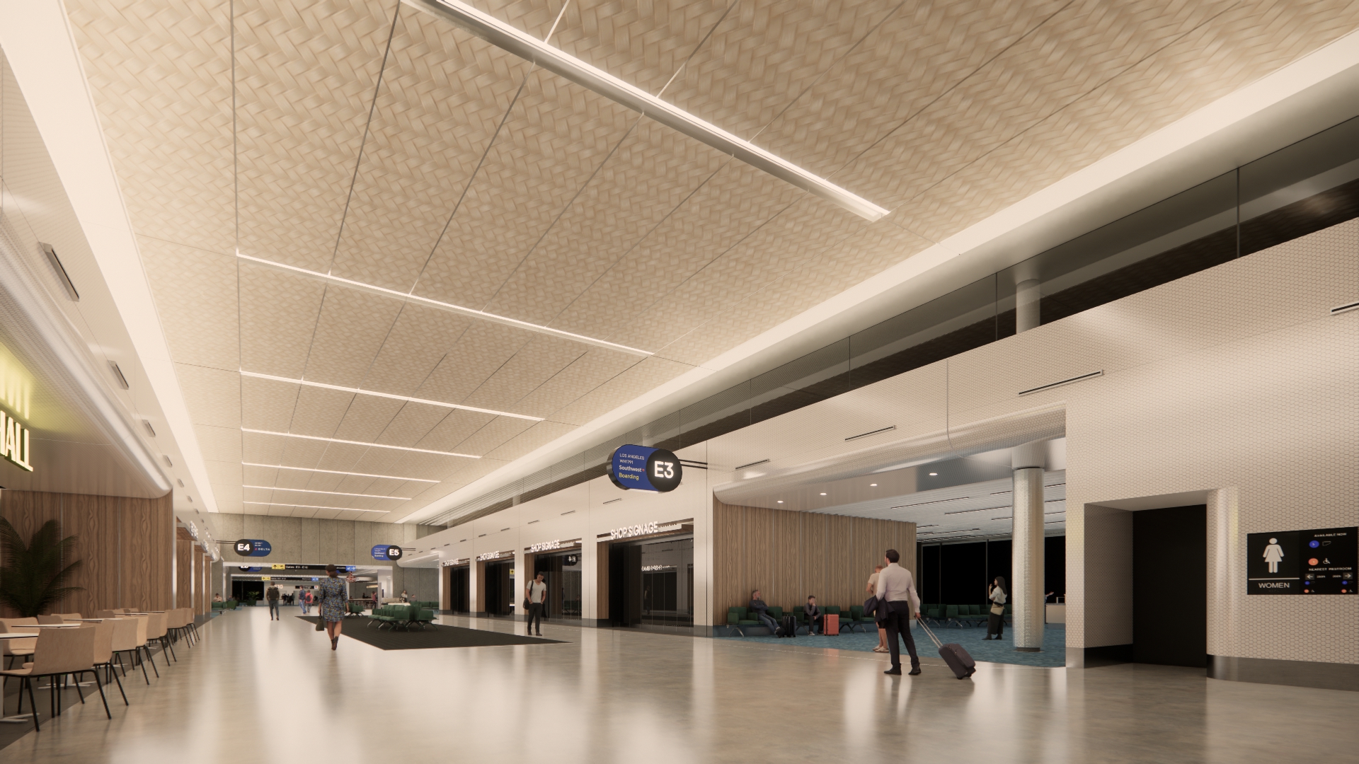 add passengers add hawaiian geometric pattern themed elegant and simple mosaic art that is made from silver white champagne color tiles on to the white wall and fascia add speaking led dots throughout the ceiling randomly