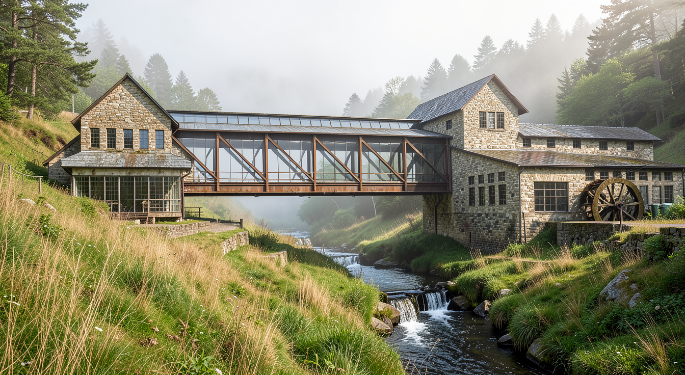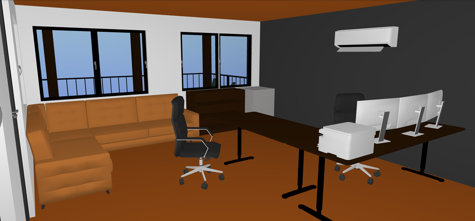 this is the managers office on the second floor of a large communal condo building the couch is a tan leather and next to the brown bookshelf is a dark stainless steel mini fridge the ceiling and floor should be in a reddish stained walnut plank with the walnut planks going front to back outside of the windows are spruce and pine trees with golden hour lighting