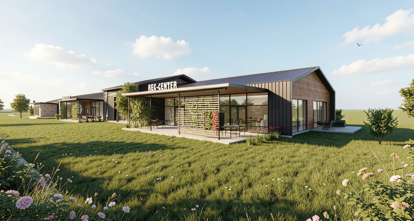 rendering with vertical wood siding black window frames and a dark gray standing seam metal roof keep existing background add a path from the building to the parking lot