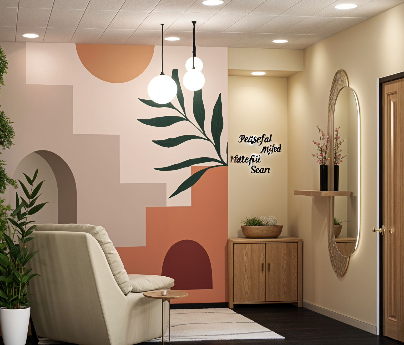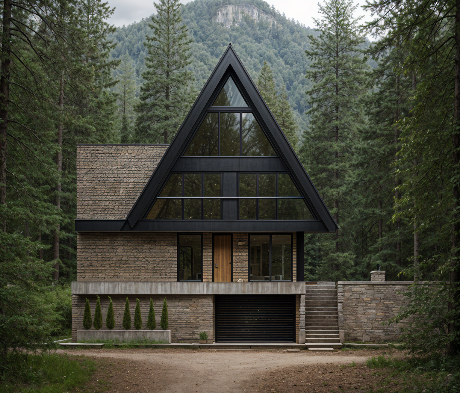 replace the wooden cladding with photorealistic vertical slatted wood in a natural color showing visible grain and subtle variations replace the existing stone walls with large smooth stone panels similar in tone to the original rock but without visible grain texture giving a clean and refined appearance replace the background with a neutral minimal one soft grey or white to highlight the architecture ensure high resolution photorealistic architectural quality