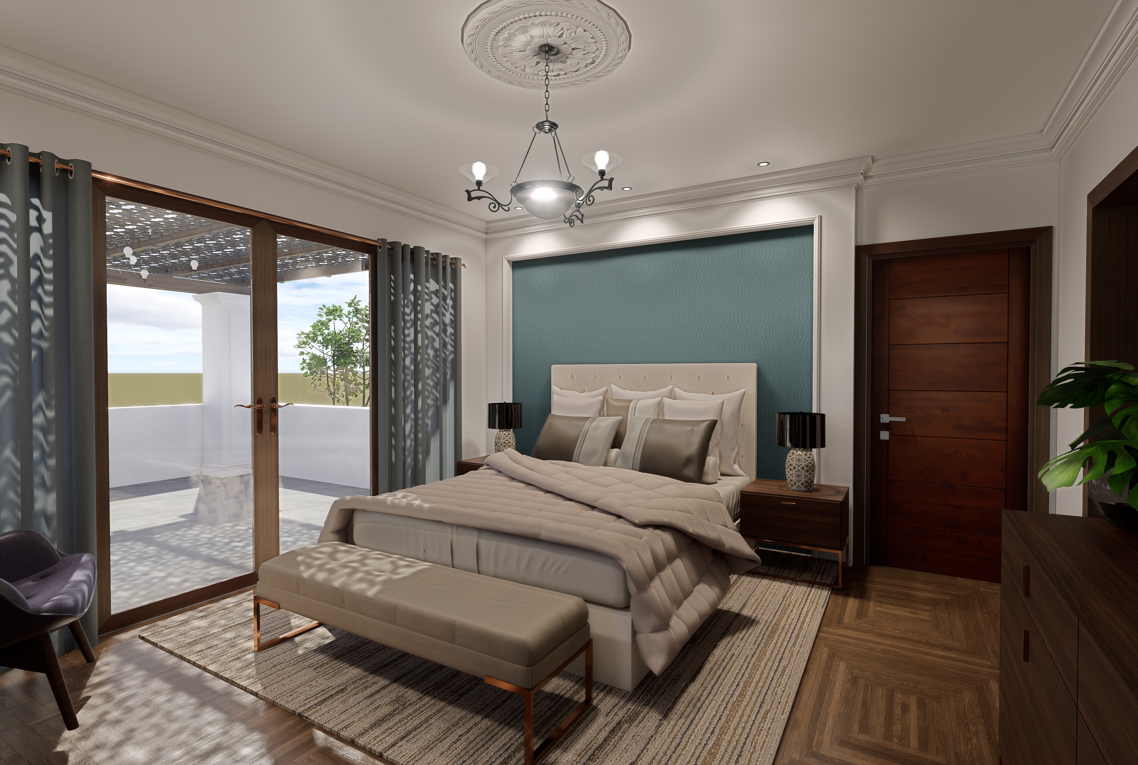 photorealistic 8k high quality architectural rendering of a modern bedroom a central bed with a beige upholstered headboard and soft linen bedding with detailed textures an accent wall behind the bed in petrol blue with a microcement texture warm diffused lighting emanates from a classic black chandelier and symmetrical table lamps floor to ceiling windows reveal an outdoor terrace bathed in soft natural sunset light creating gentle shadows and realistic reflections on the wooden floor inviting ambiance warm minimalist style crisp details and cinematic post processing