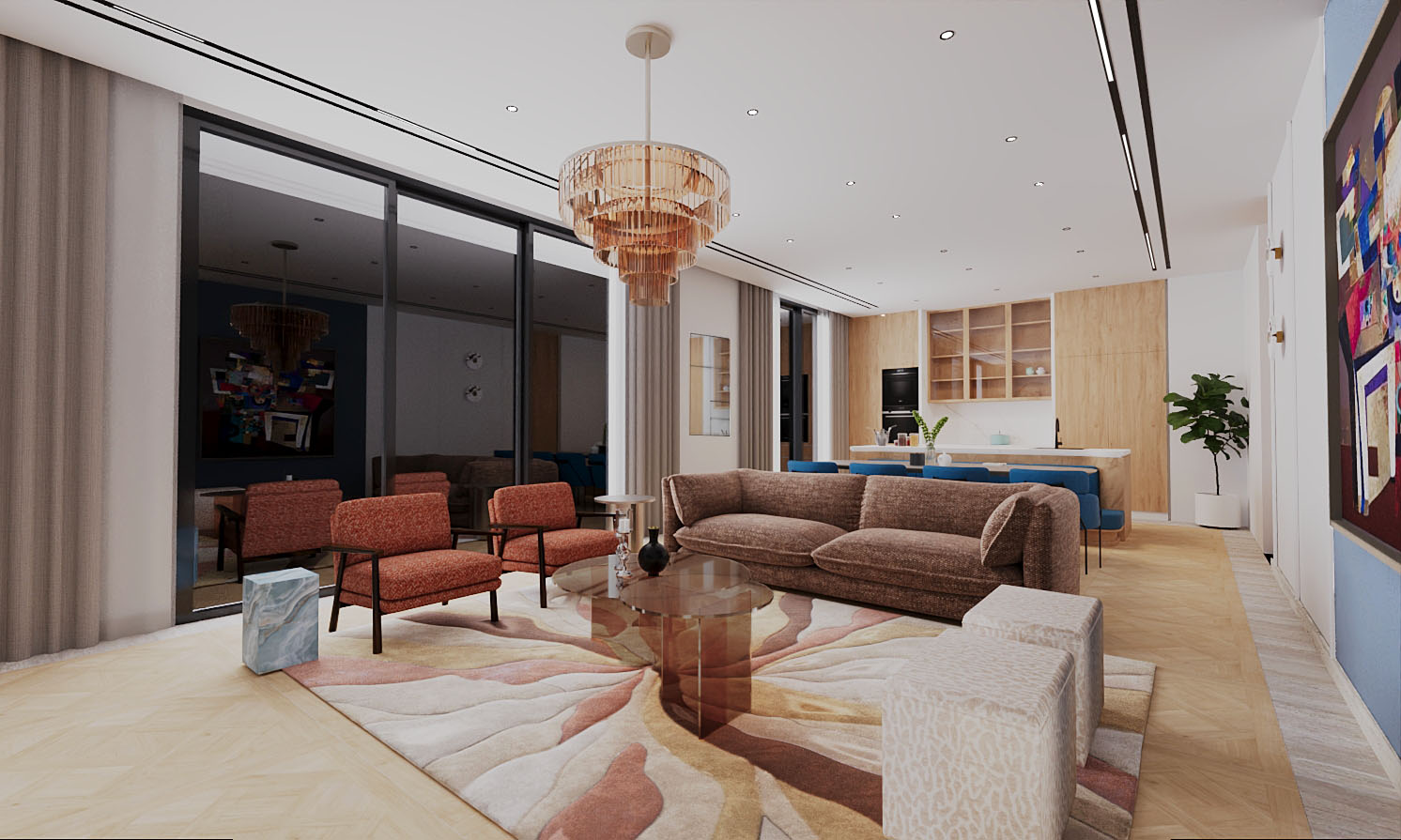 add an outdoor terrace with a boundary wall outside the window make it look daytime but not sunset replace the tree at the back with a funky sculpture keep everything else exactly the same