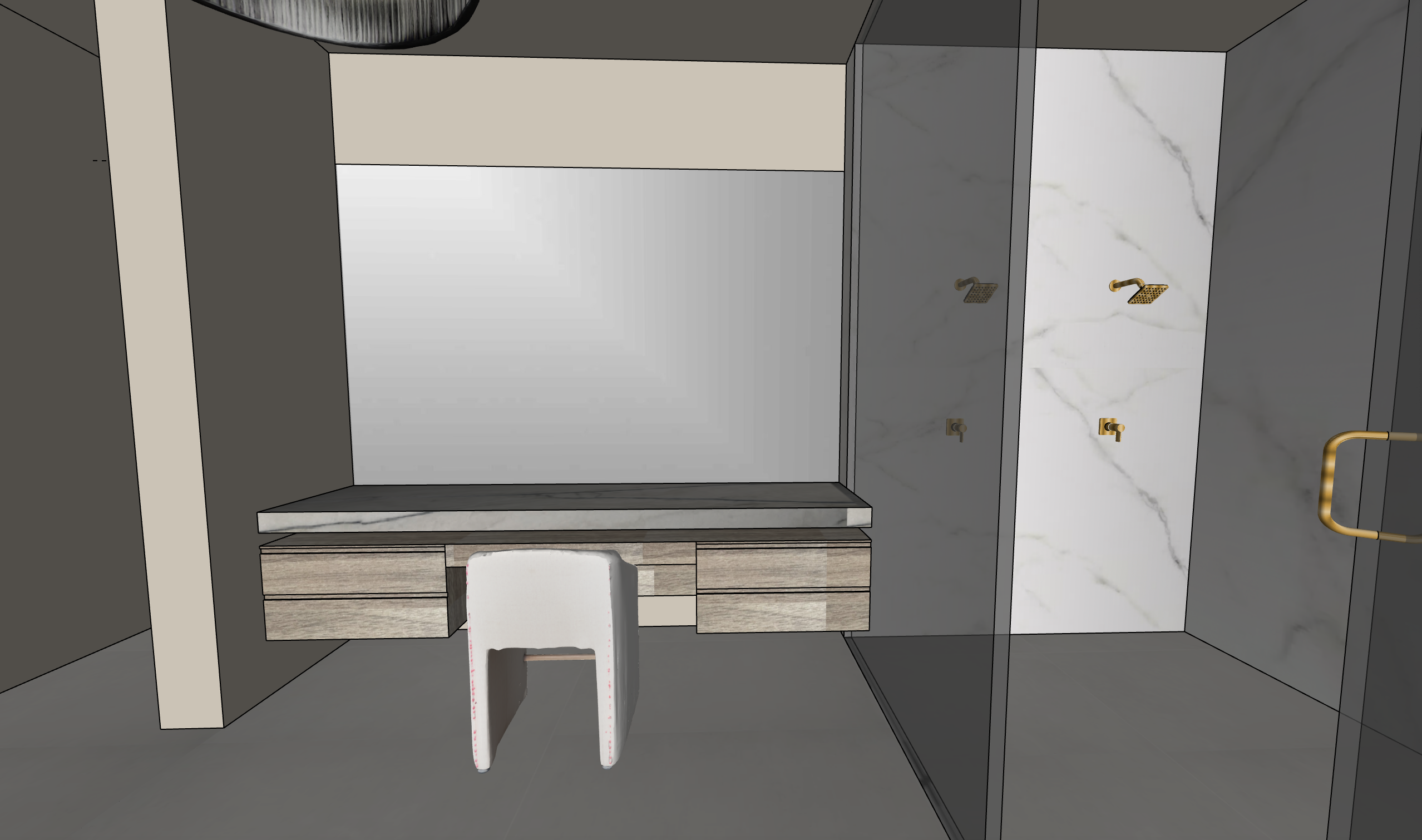 render a modern bathroom interior with a sleek minimalist design the floors are a matte ivory porcelain the mirror spans the length of the vanity up to the ceiling reflecting a crisp clean aesthetic the makeup vanity is adorned with a light marble countertop with grey veins and light wood drawers adding a touch of natural elegance the glass shower partition and door accentuate the spaciousness with a delicate gold handle and fixtures adding an element of luxury the shower walls are soft veined in white marble exuding sophistication overall create a tranquil and stylish ambiance with natural light softly illuminating the room with the small and long window above the mirror the span of the vanity