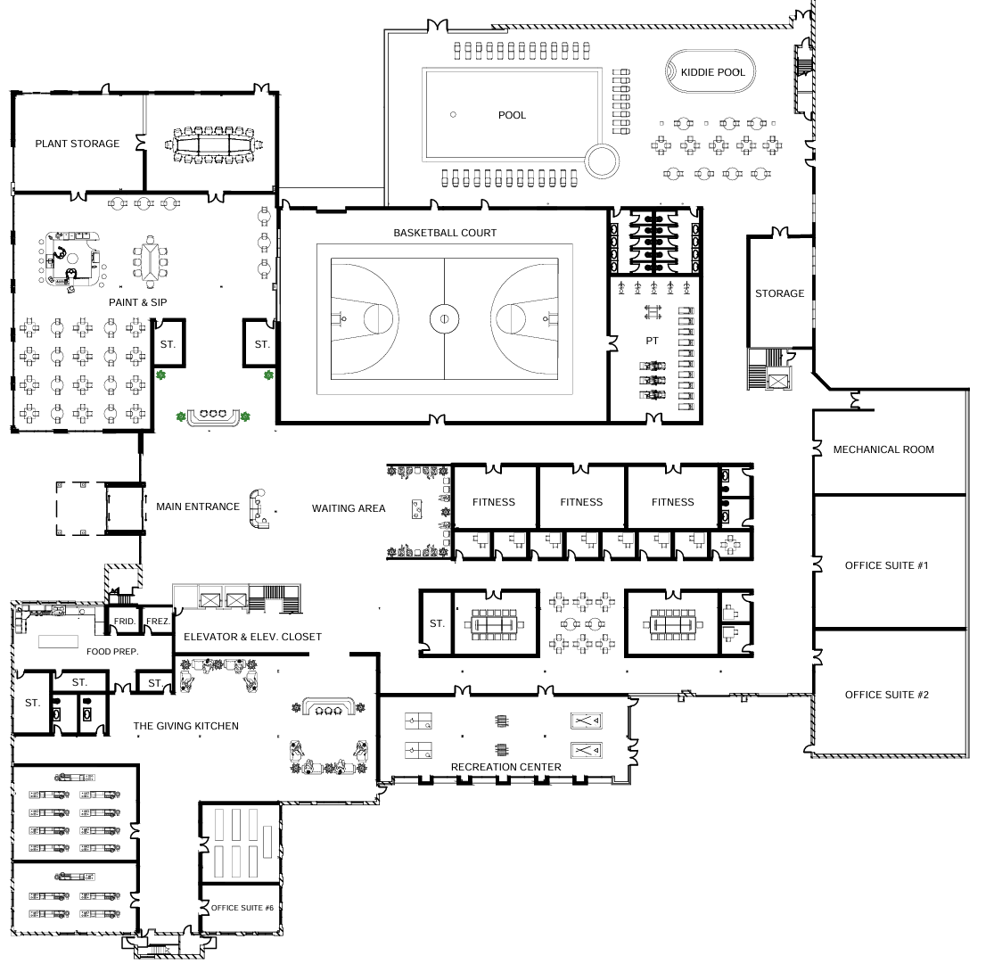 convert this floor plan into a realistic isometric 3d view of a full house show the space from an elevated angle with furniture walls and details visible euopean bistro furniture style use the same furniture as shows on the plan do not change the orientation of the floorplan
