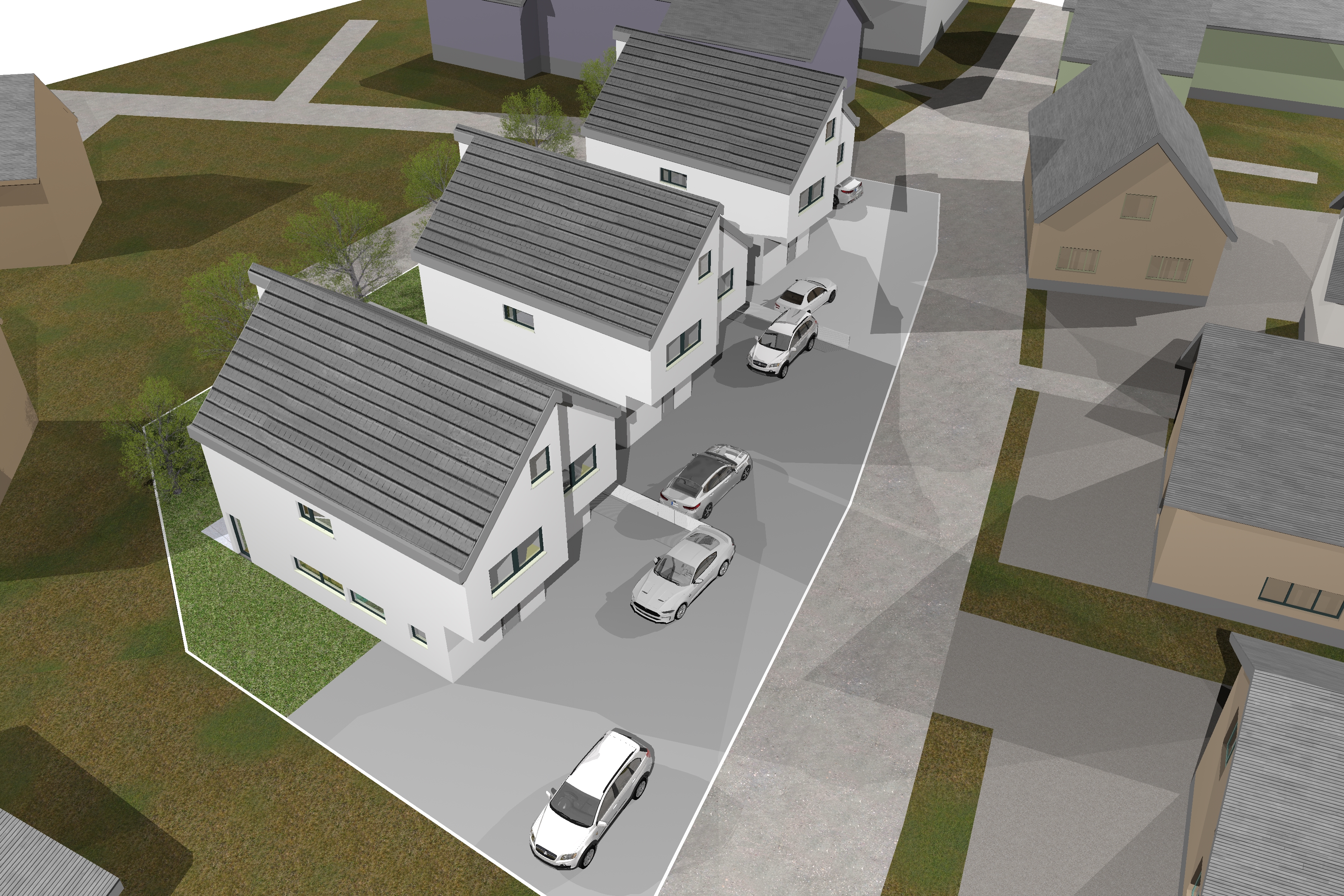white facades summer sunny with clouds surround houses should be lower add trees greener environment architecture