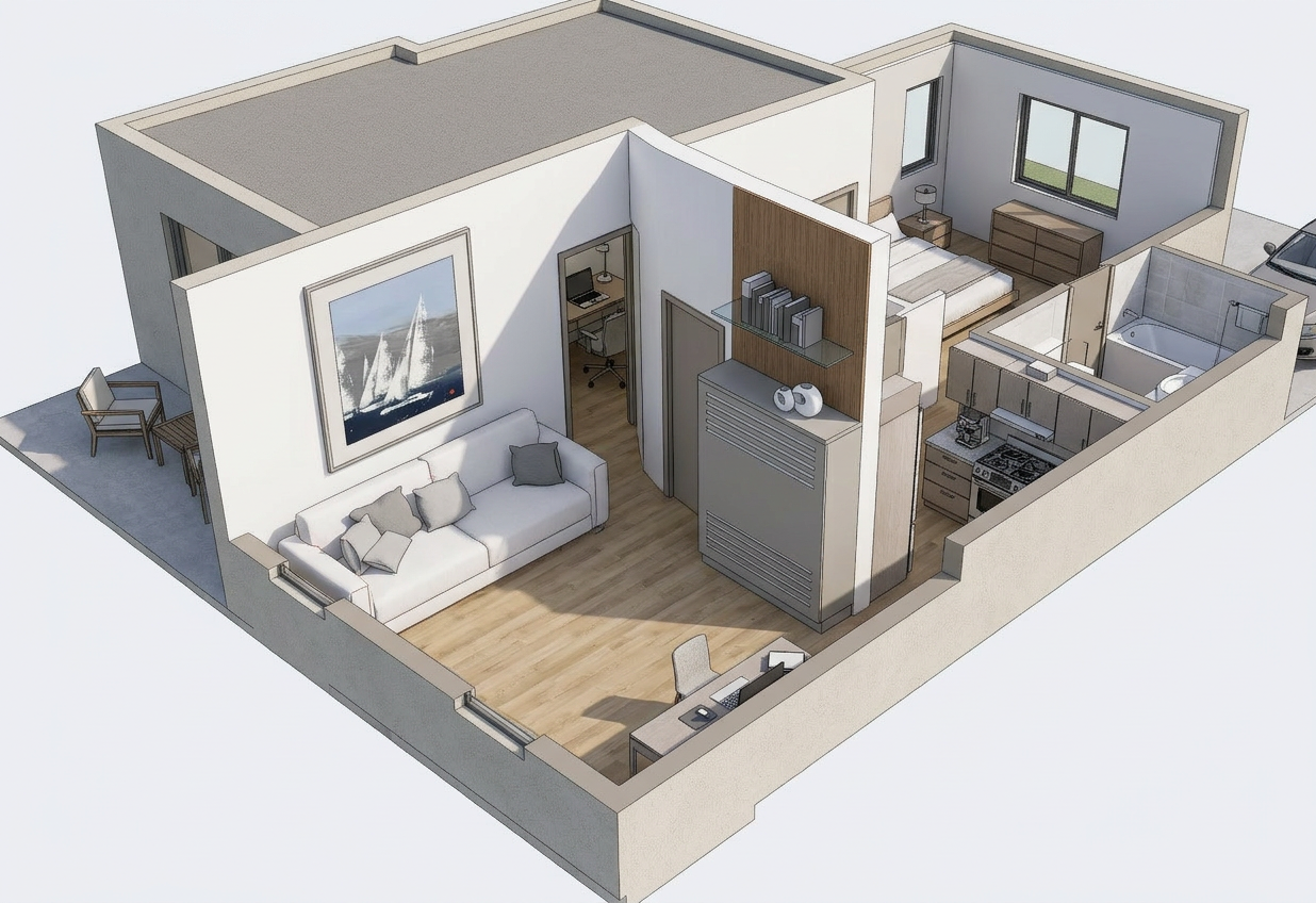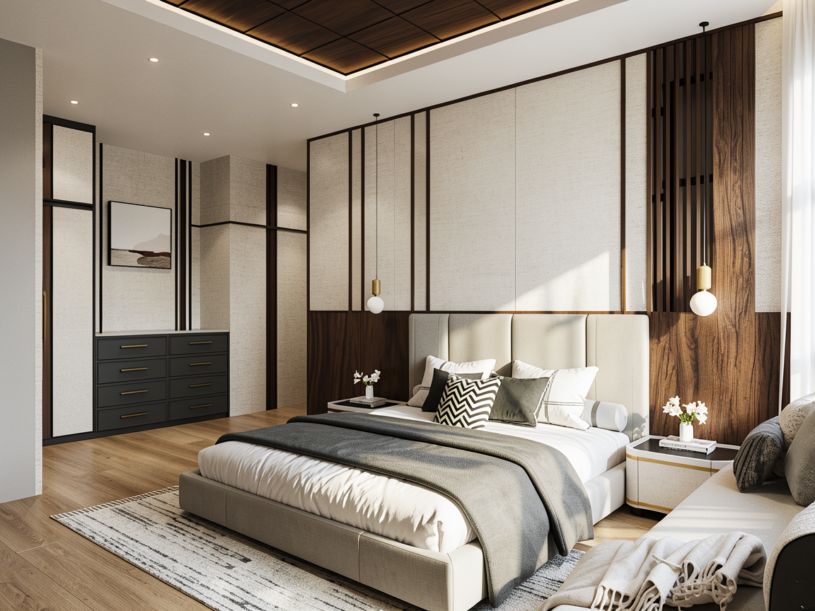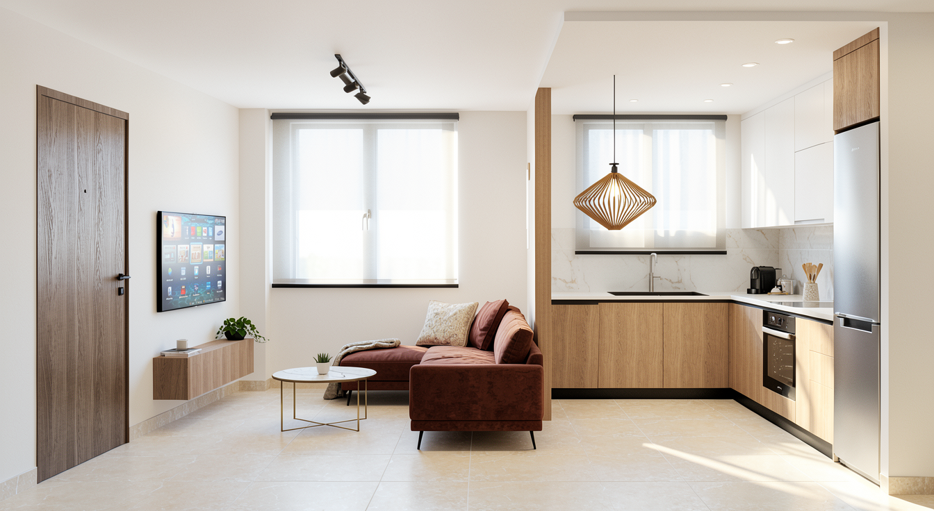 render a modern living room with a cozy and artistic atmosphere include a plush off white sectional sofa in the center on a light oak floor add a textured beige rug in front of the sofa place a potted plant with vibrant green leaves near a sleek dark tv stand on the left use earth tones for the wall art and add minimalistic brass frames incorporate a light colored rattan chair with a soft pink cushion the walls should be a soft warm gray use large windows with sheer beige curtains to let natural light flood in creating a warm inviting ambiance