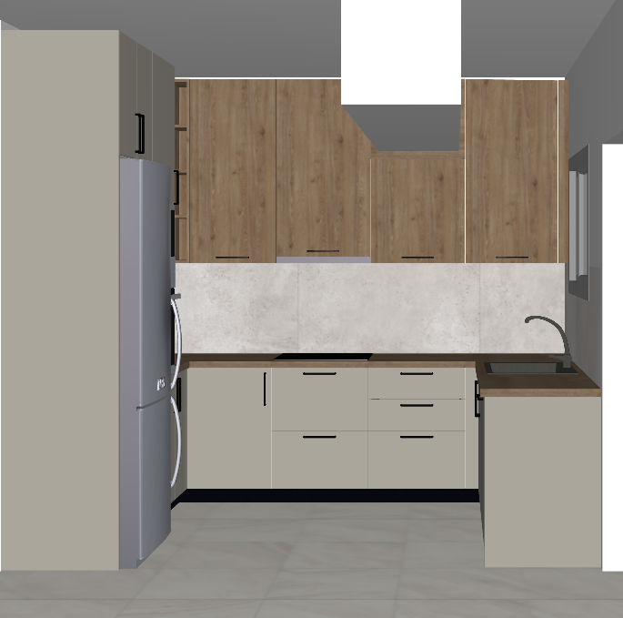 render a modern kitchen with a cozy inviting atmosphere use soft beige for the cabinets and a warm medium tone wood for the upper cupboards the countertop should be a rich walnut color paired with a stainless steel refrigerator for a sleek contrast incorporate a light gray backsplash with subtle texture enhance the space with soft natural lighting to create a warm ambiance the flooring should be light gray with a hint of texture completing the contemporary yet welcoming look