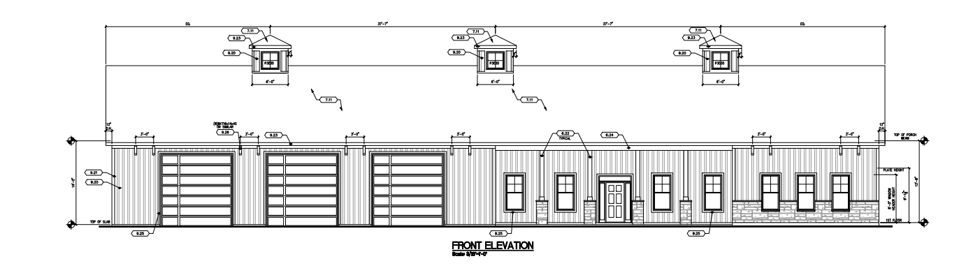 the siding of the barn is warm white color paired with a dark brown metal roof the windows are black to provide a nice contrast the front door is a rich stained brown color that matches the wood columns on the front porch the stone is a mix of grey and brown the 3 garage doors on the left are black with no windows the overall background of the home is spring day on land