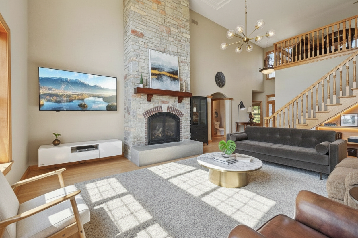wide the view and enhance detail smooth the face of the sone and add land scaping left and right