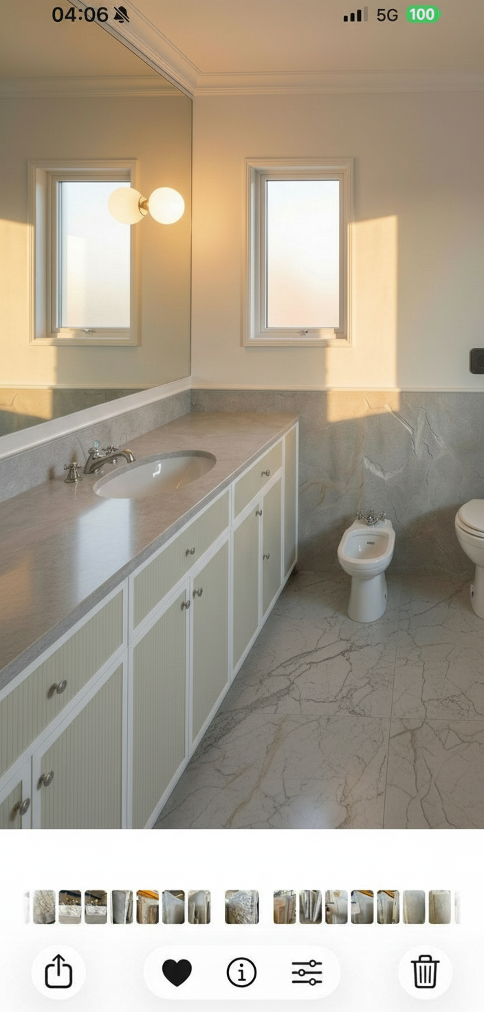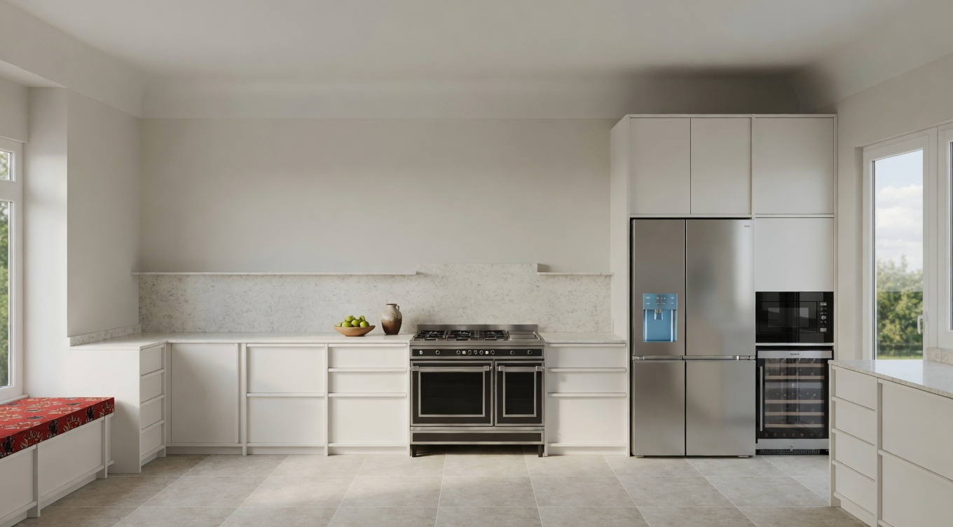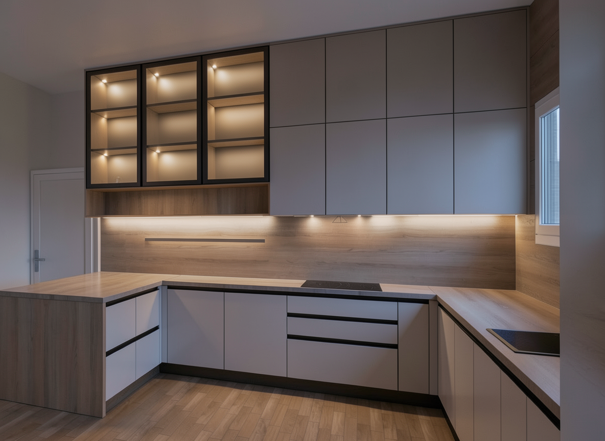 international style interior shot plan de travail credence tablettes fixes au dessus cr dence en pierre beige clair avec veinage marron clair meubles de cuisine en fa ade laqu gris bleut sol en carreaux ciment 25 x 25 cm fond bleu motif rouge brique blanc gris ciment piano de cuisson en fa ade inox bross cache hotte droit en platre blanc a 70 cm de la cuisson applique jielde noir mat a droite et gauche de la hotte architecture