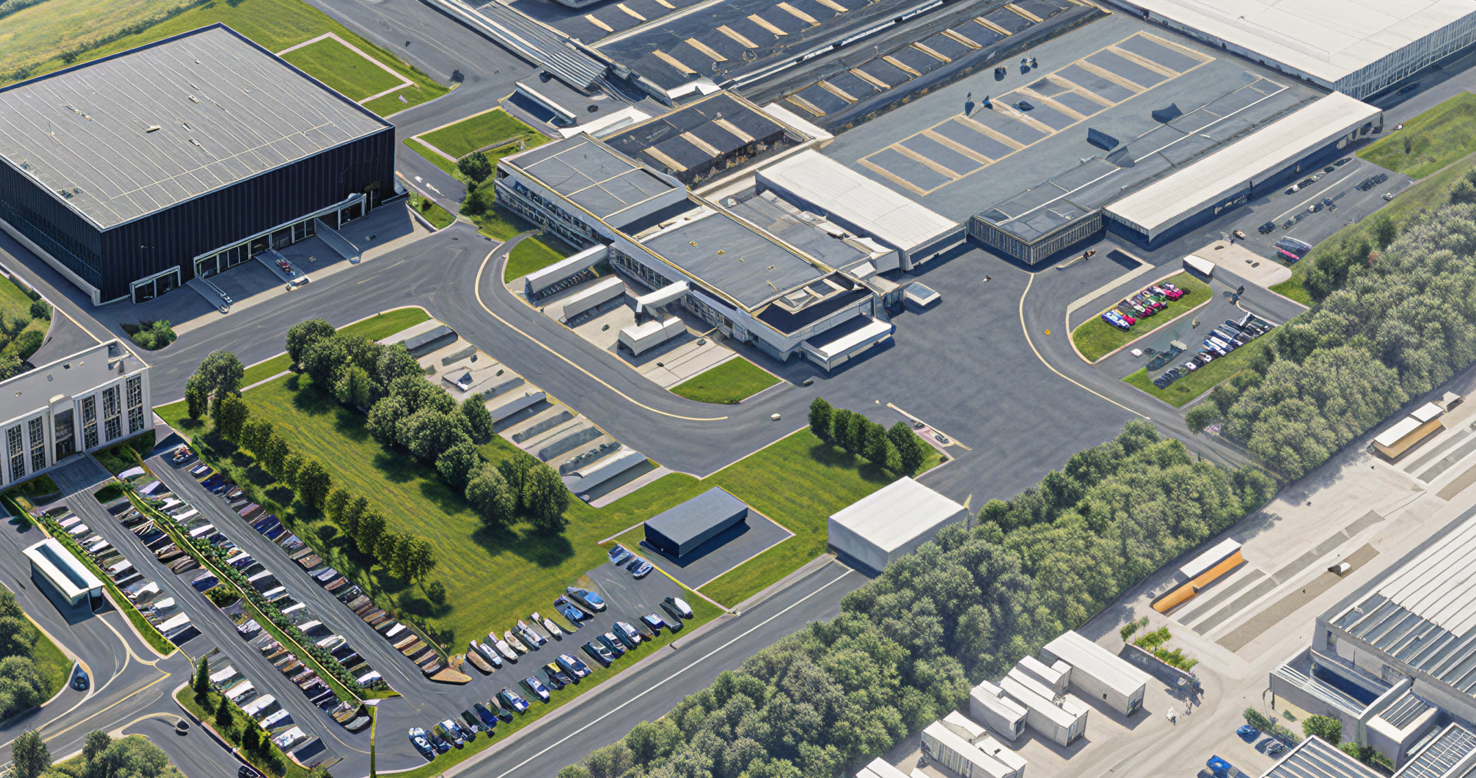 architectural abstract model vision based on the provided aerial image of an industrial and logistics campus oblique aerial view camera unchanged overall style abstract campus model between physical study model and future vision calm reduced spatially expressive architecture buildings remain in position and scale volumes simplified clean matte light toned edges sharp roofscapes ordered no surface detail no material realism ground and circulation roads and paved areas as continuous planes clear hierarchy through tone and width not markings curves smooth and intentional spatial flow readable abstract life and rhythm life is expressed through repetition and spacing subtle variation in positioning of abstract elements no narrative scenes vehicles pure abstract scale bars soft rectangular volumes only no car identity no parts no realism used rhythmically to indicate occupation and movement low contrast matte light grey landscape green areas as calm fields tree groups rhythmic and sculptural shadows are as important as the trees themselves light directional daylight with clear sun angle long soft shadows creating depth and orientation slight warm tone high contrast between light and shadow not between materials atmosphere quiet tension order with latent activity visionary precise timeless explicitly exclude photographic look realistic textures detailed objects storytelling scenes visual noise randomness output quality ultra high resolution cris