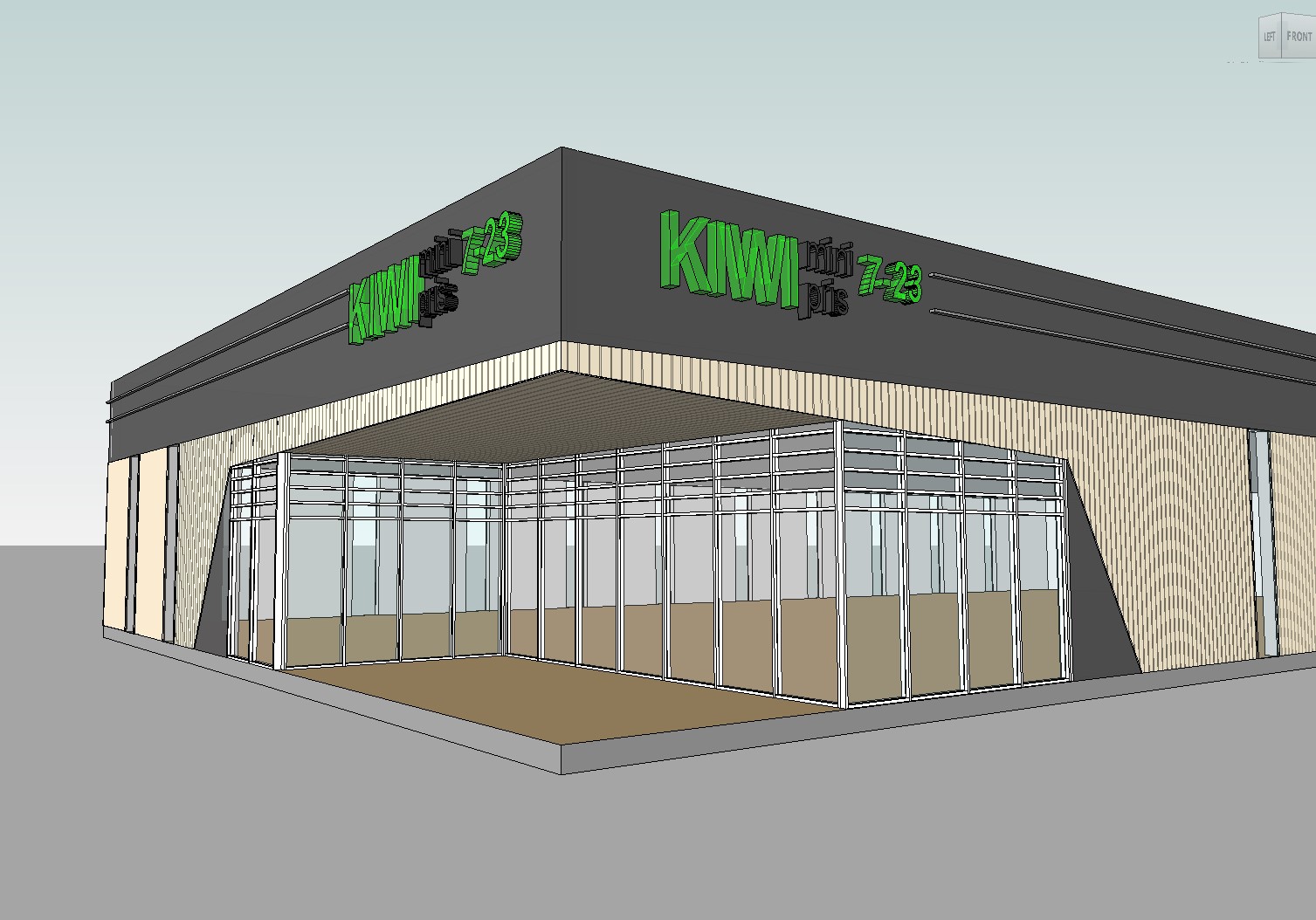 kengo kuma exterior shot visualization in the evening with people entering the store in front of it inside grocery stands are visible through the glass facade make wooden parts of facade ligten up architecture
