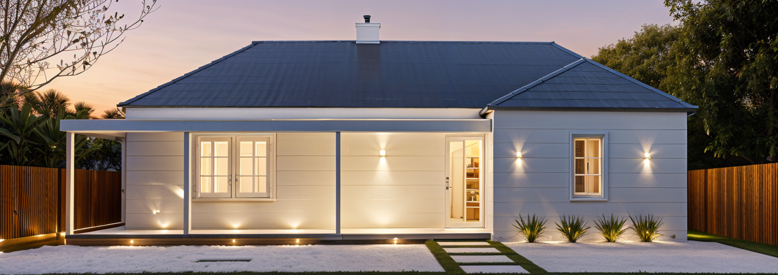 classical exterior shot in an australian rural setting at sunset with a lush green garden architecture