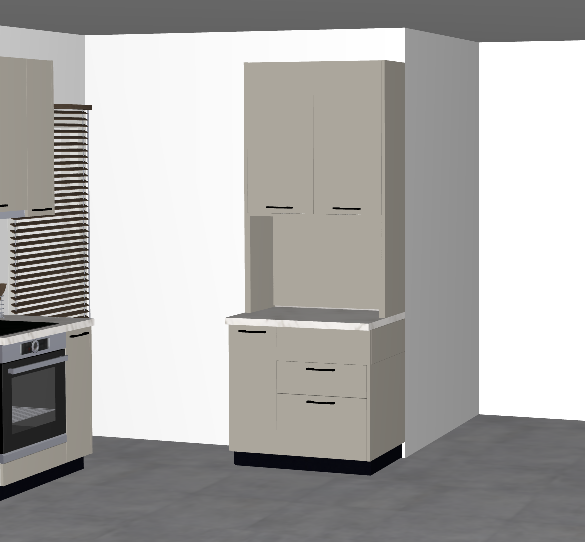 render a modern kitchen interior with sleek lines and a minimalist design use a neutral color palette featuring soft beige cabinetry with subtle black handles incorporate a stainless steel refrigerator with an elegant finish apply a light gray stone texture for the countertop and backsplash for a sophisticated look add a touch of greenery with small potted plants on the counter allow natural light to filter through wooden blinds on the window casting warm shadows on the walls maintain a clean organized ambiance with a slightly warm atmosphere to make the space inviting and modern