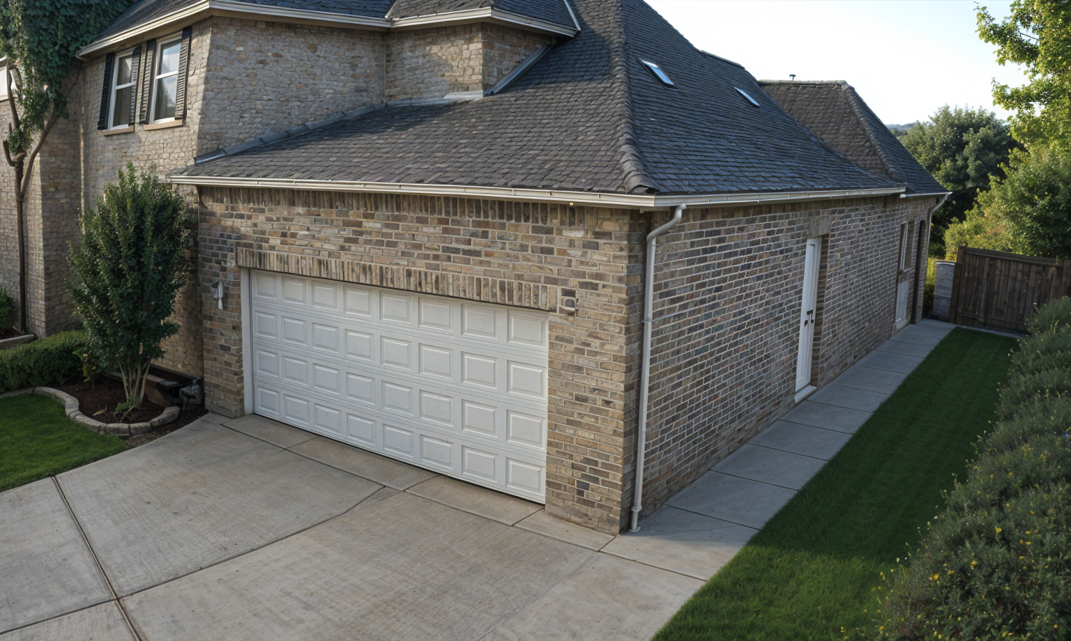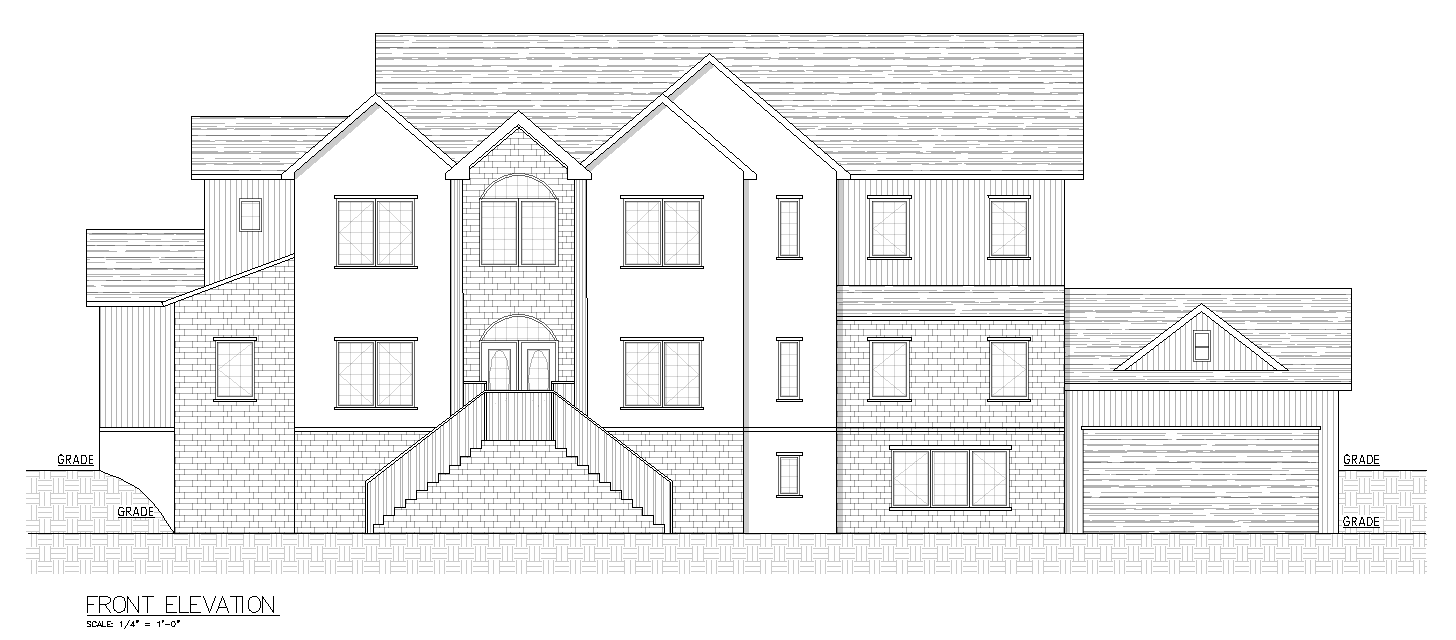 a house with the bottom brick areas and main entry wall gray stone dark gray vertical vinyl siding where it shows siding and the other empty areas white also the stairs only come up from the sides not the front