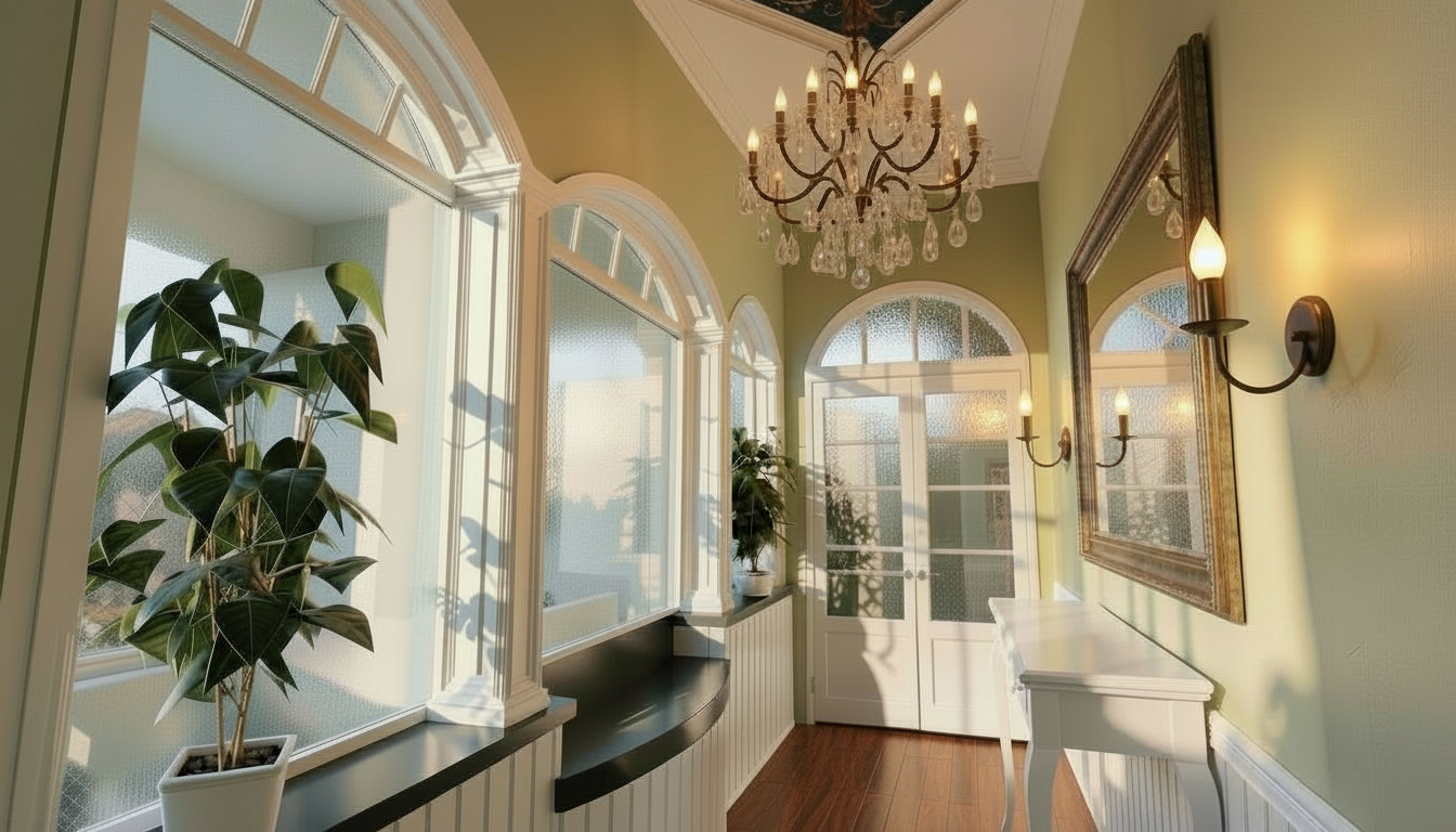 create a warm lit foyer with light filtering through the french doors the walls should be a tannish yellow color with white beadboard the hardwood floors should be a dark rich brown everythign should looks extremely realistic cozy and high end the bench cushion by the windows should be soft looking with minimal cushion and now pillows thw white entry table should feature a few books and a lit candle